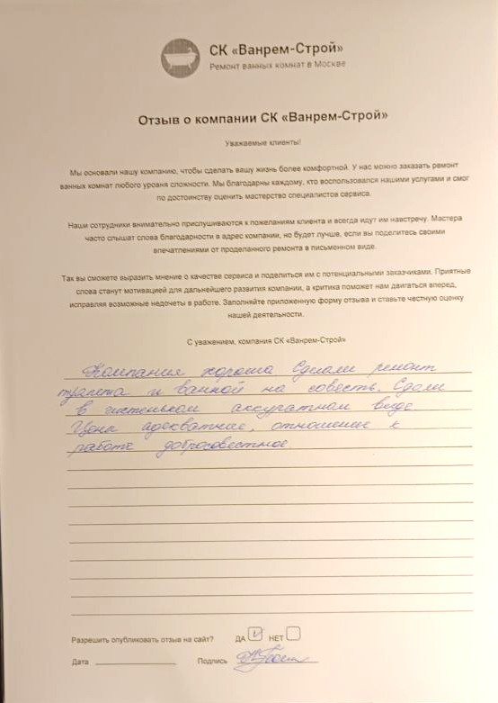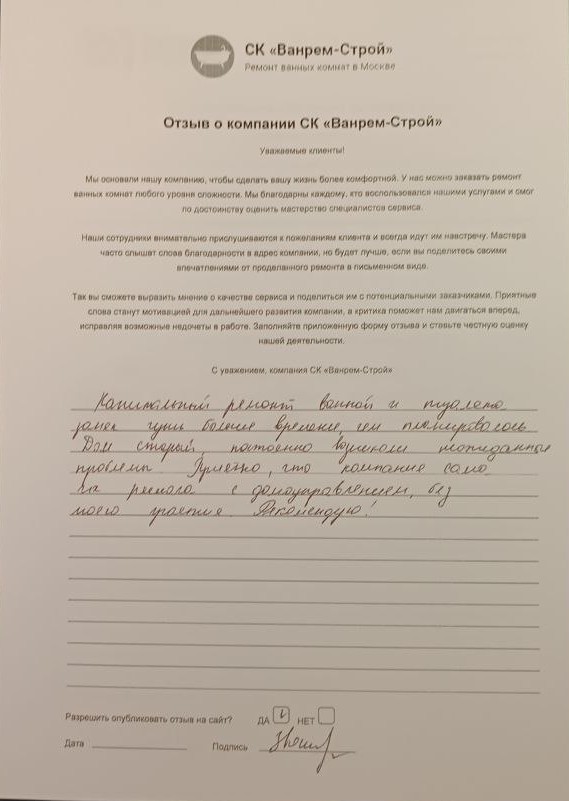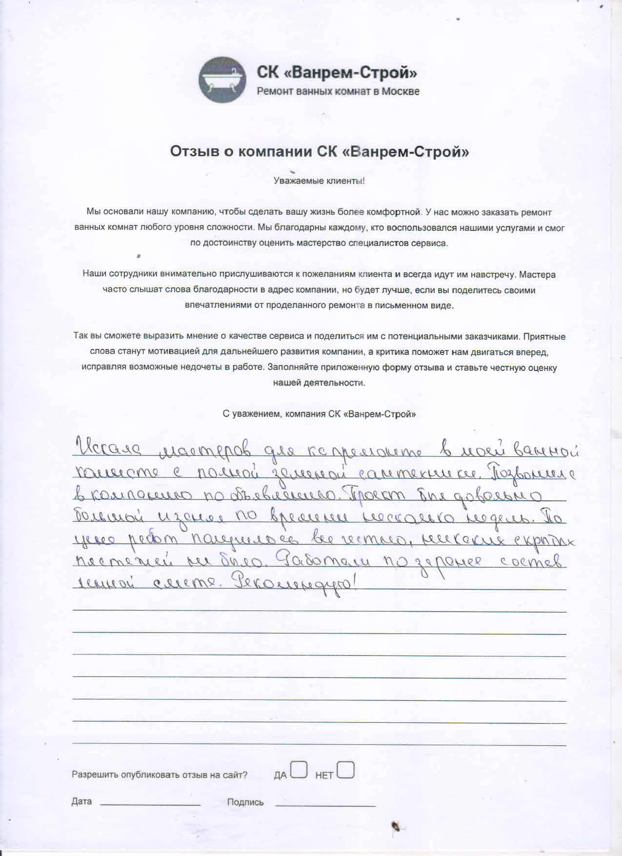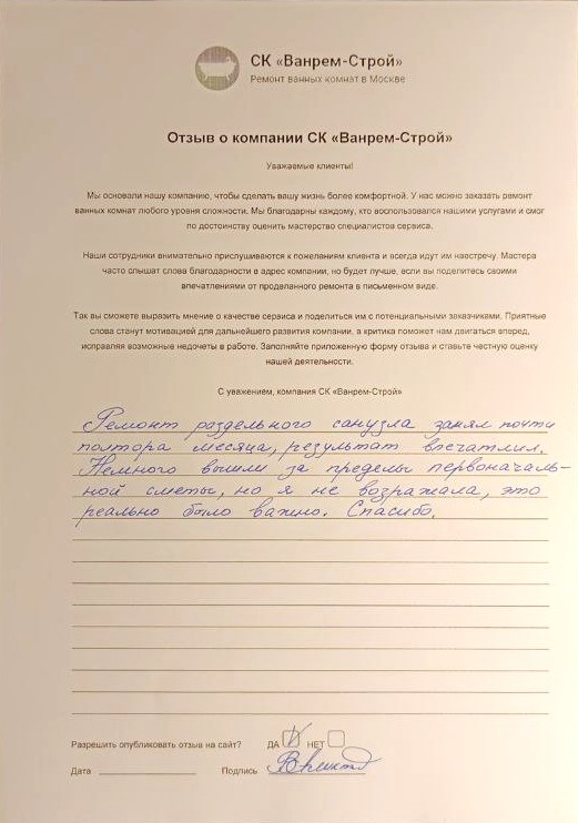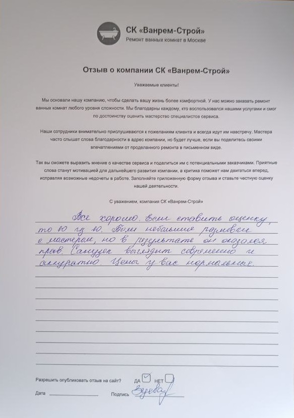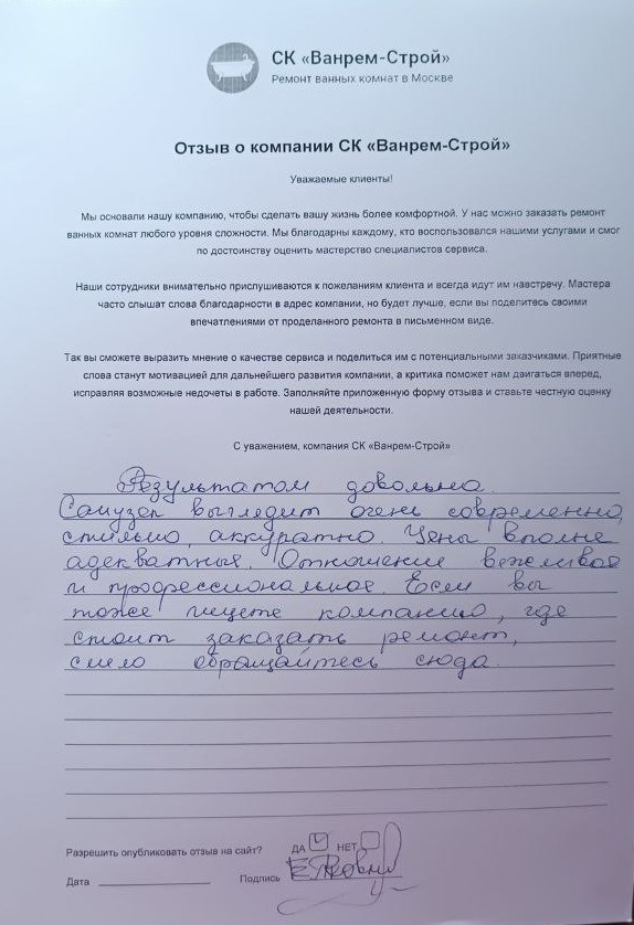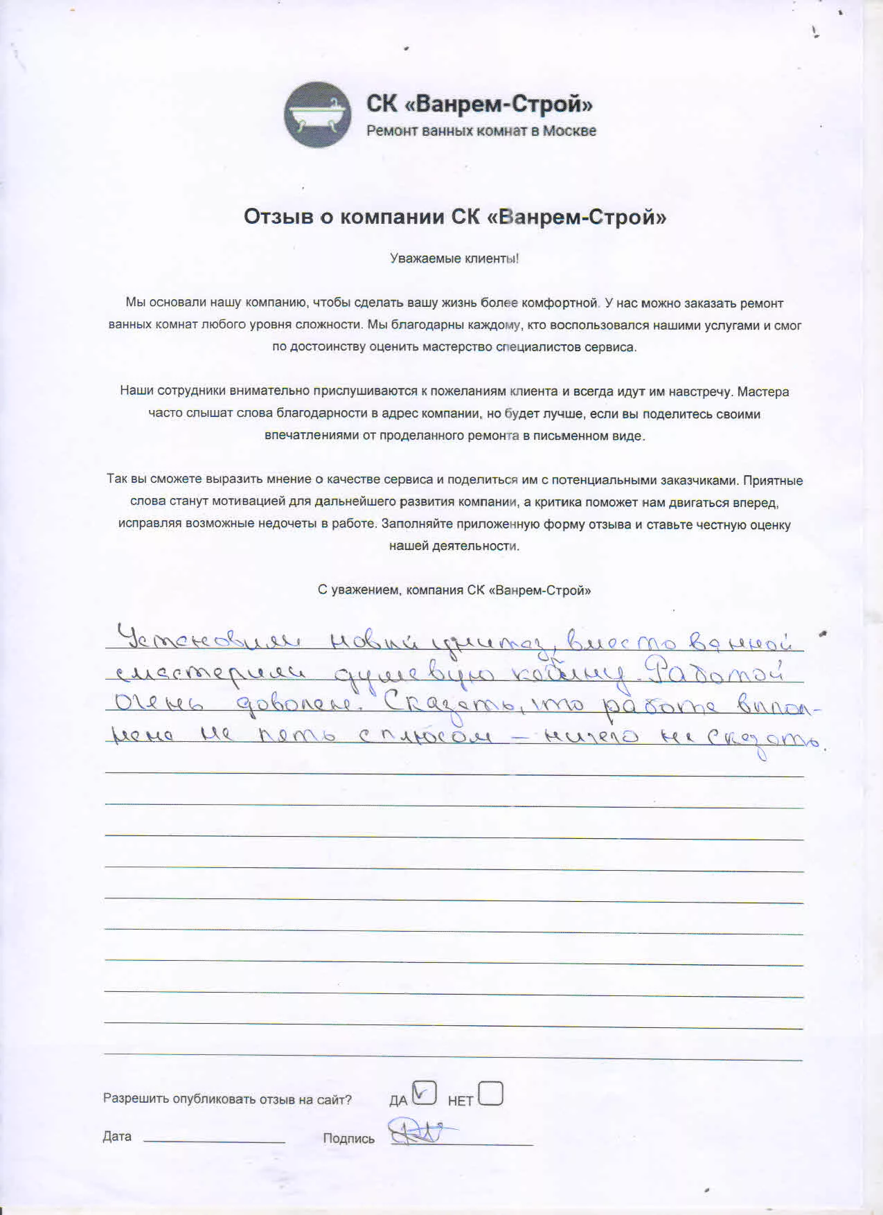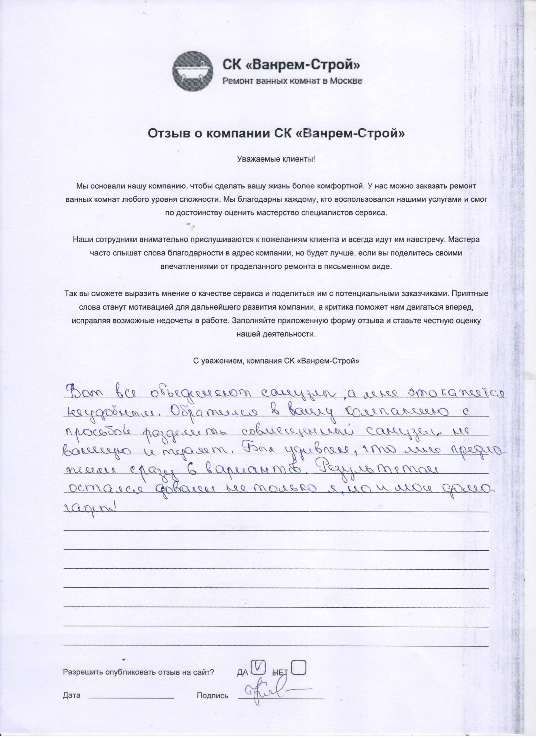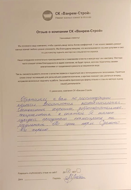 Реальные заказчики дают объективную оценку комплексной работы коллектива сотрудников СК «Ванрем-Строй». Для получения достоверной информации о качестве предоставляемых нами услуг по ремонту ванных комнат, санузлов и туалетов, изучите отзывы клиентов нашей компании.