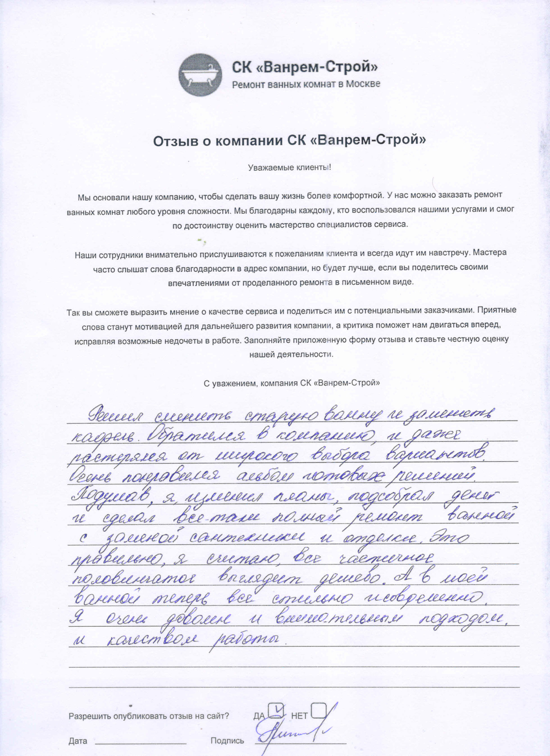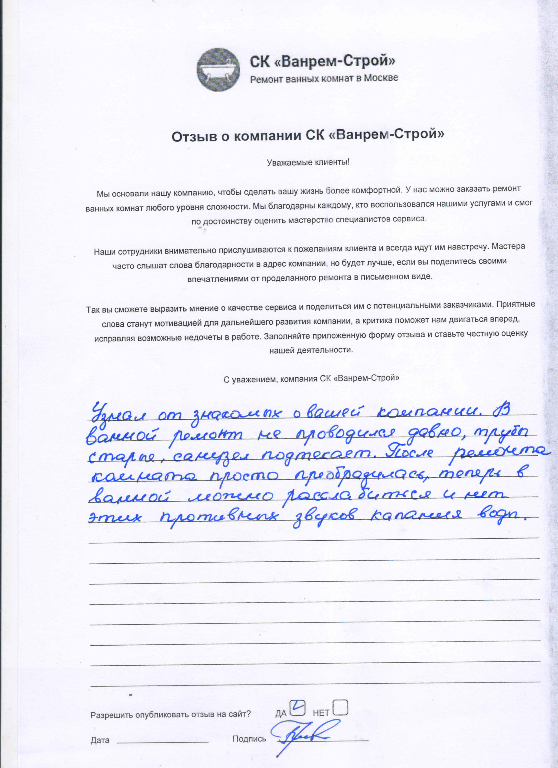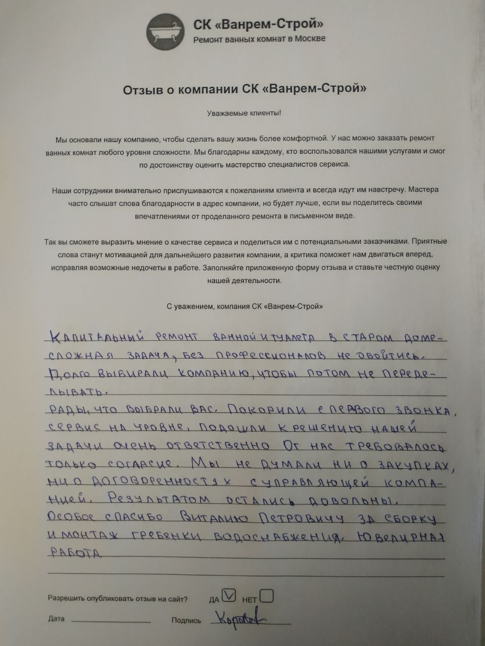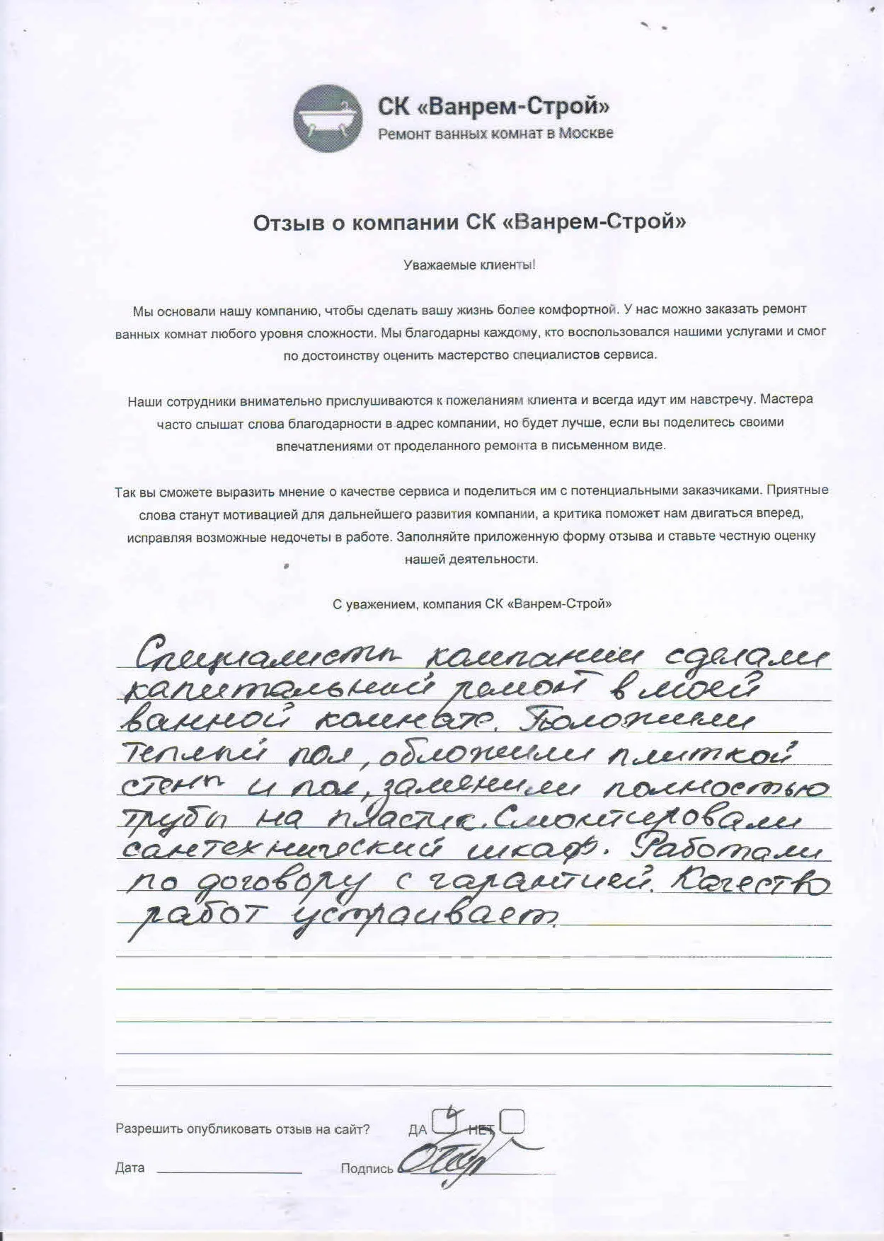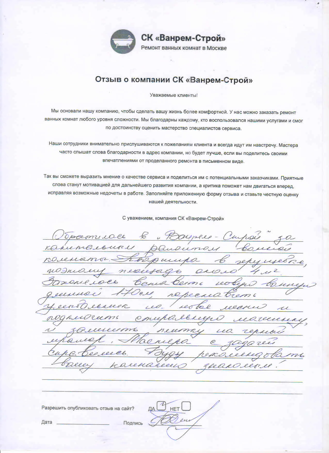 Реальные заказчики дают объективную оценку комплексной работы коллектива сотрудников СК «Ванрем-Строй». Для получения достоверной информации о качестве предоставляемых нами услуг по ремонту ванных комнат, санузлов и туалетов, изучите отзывы клиентов нашей компании.