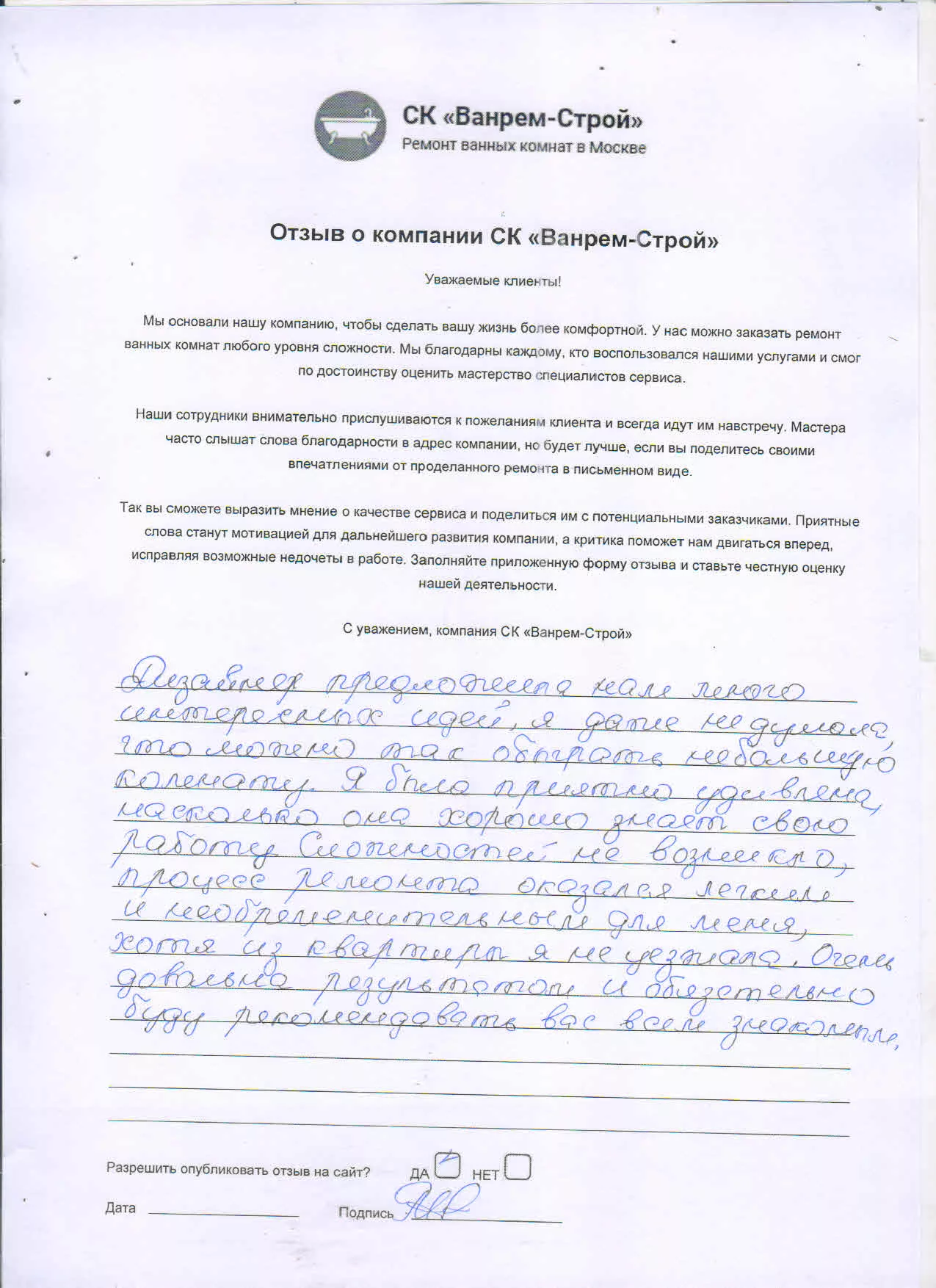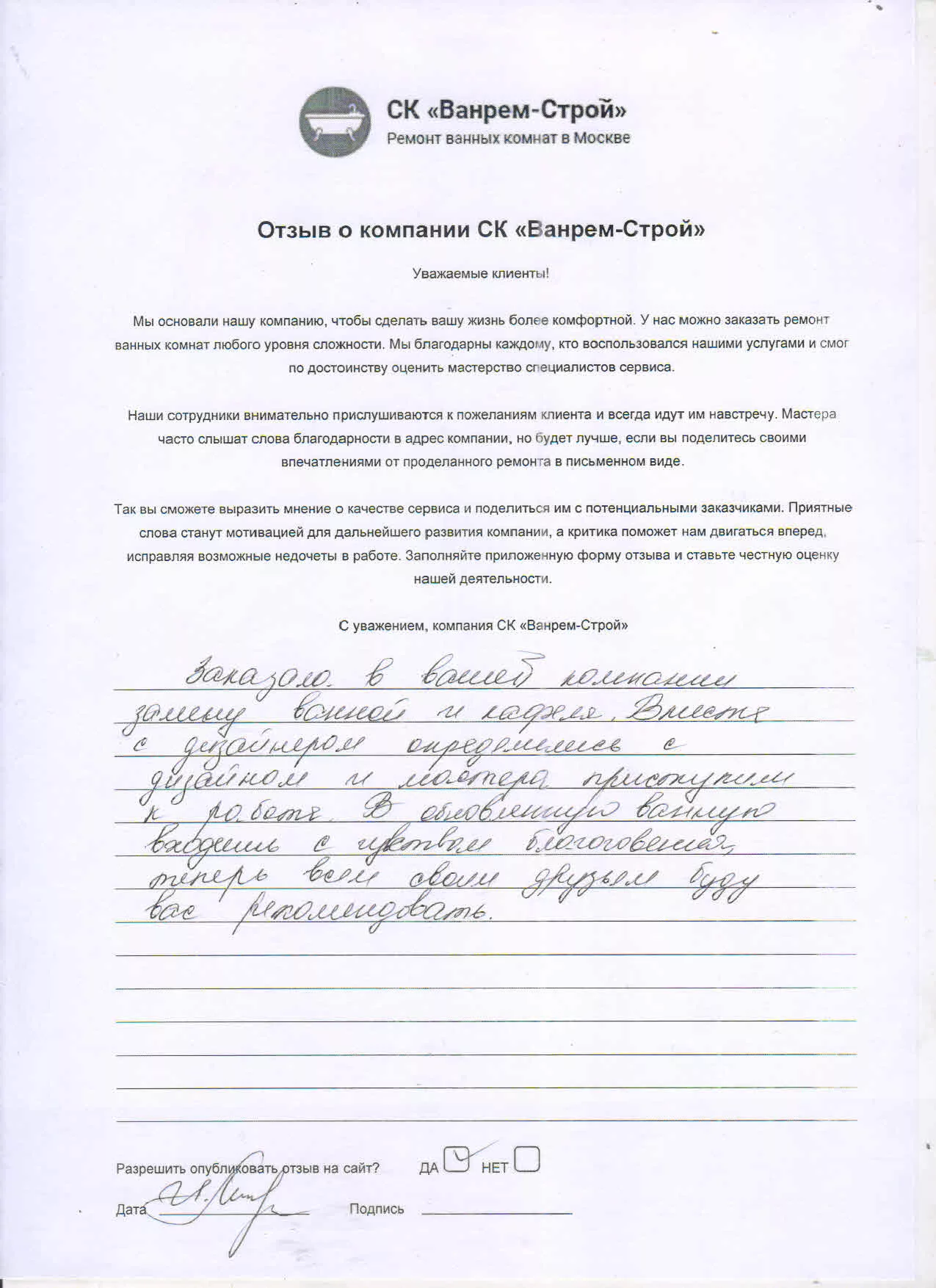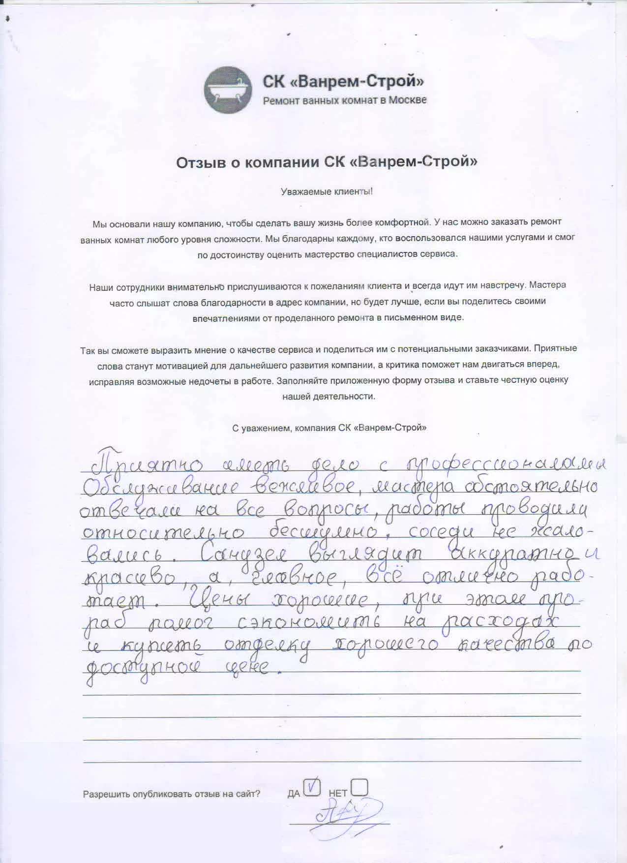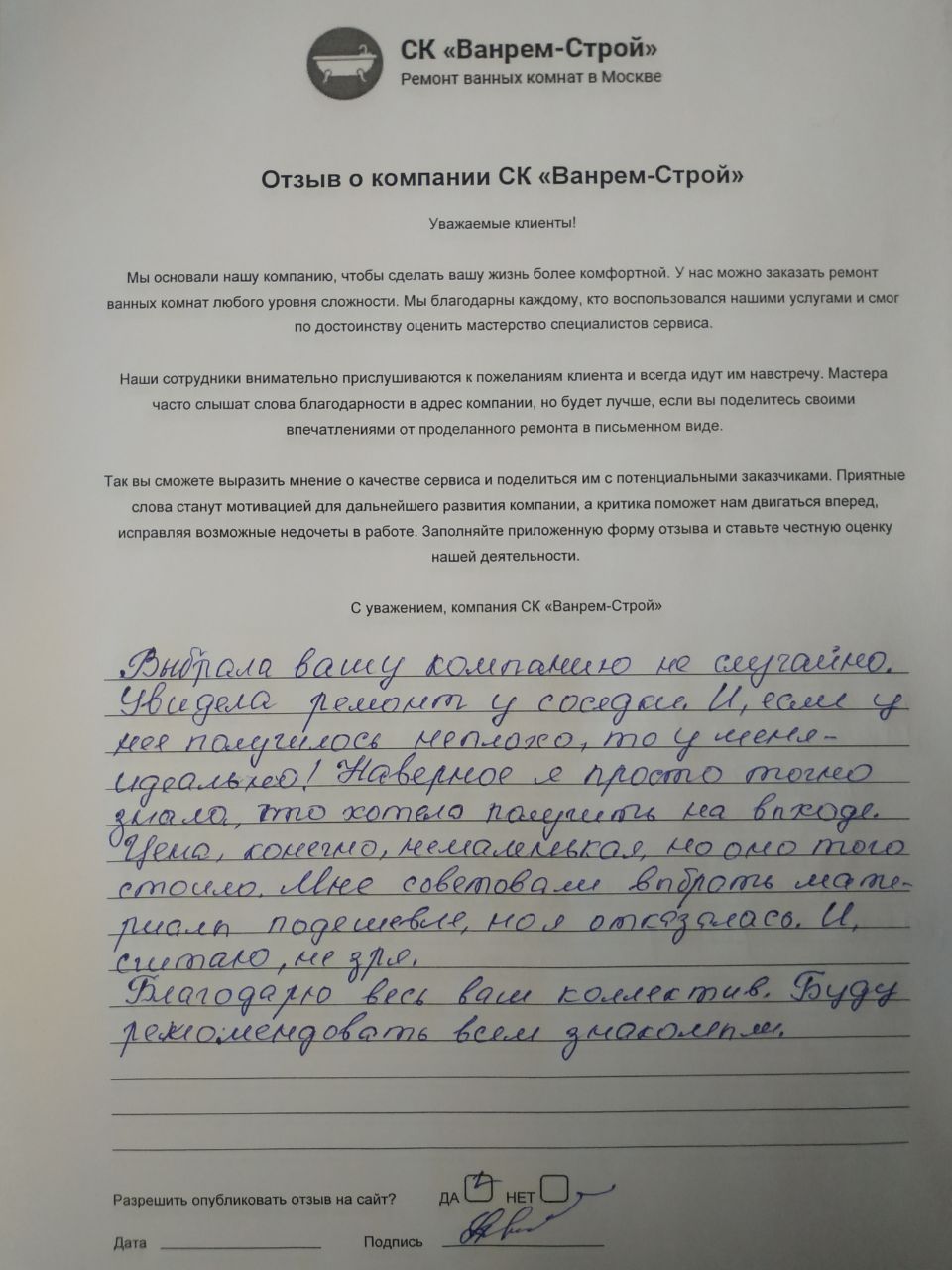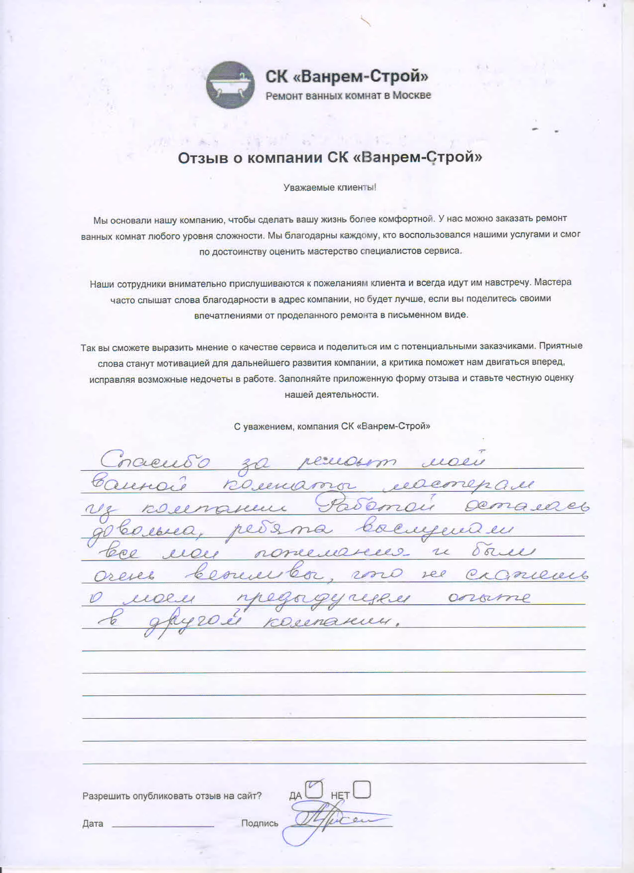 Реальные заказчики дают объективную оценку комплексной работы коллектива сотрудников СК «Ванрем-Строй». Для получения достоверной информации о качестве предоставляемых нами услуг по ремонту ванных комнат, санузлов и туалетов, изучите отзывы клиентов нашей компании.