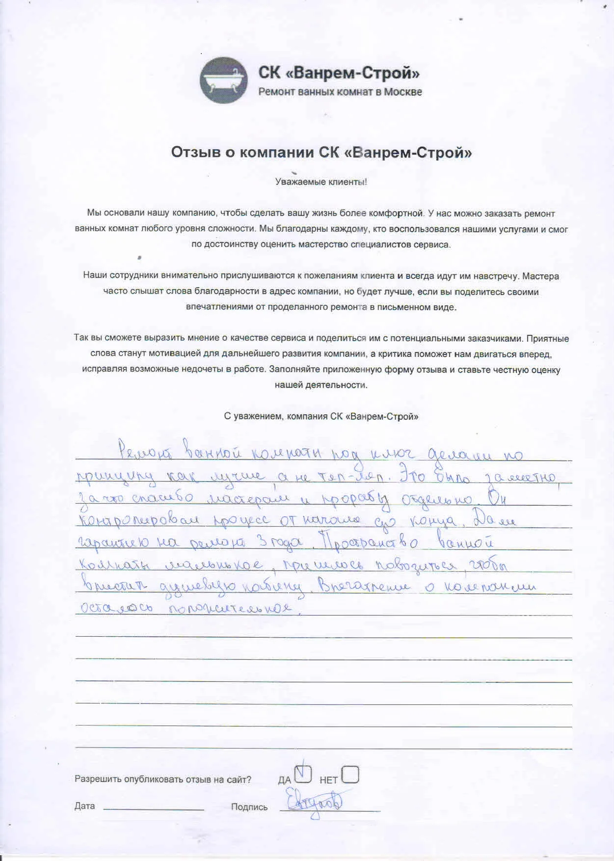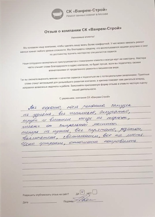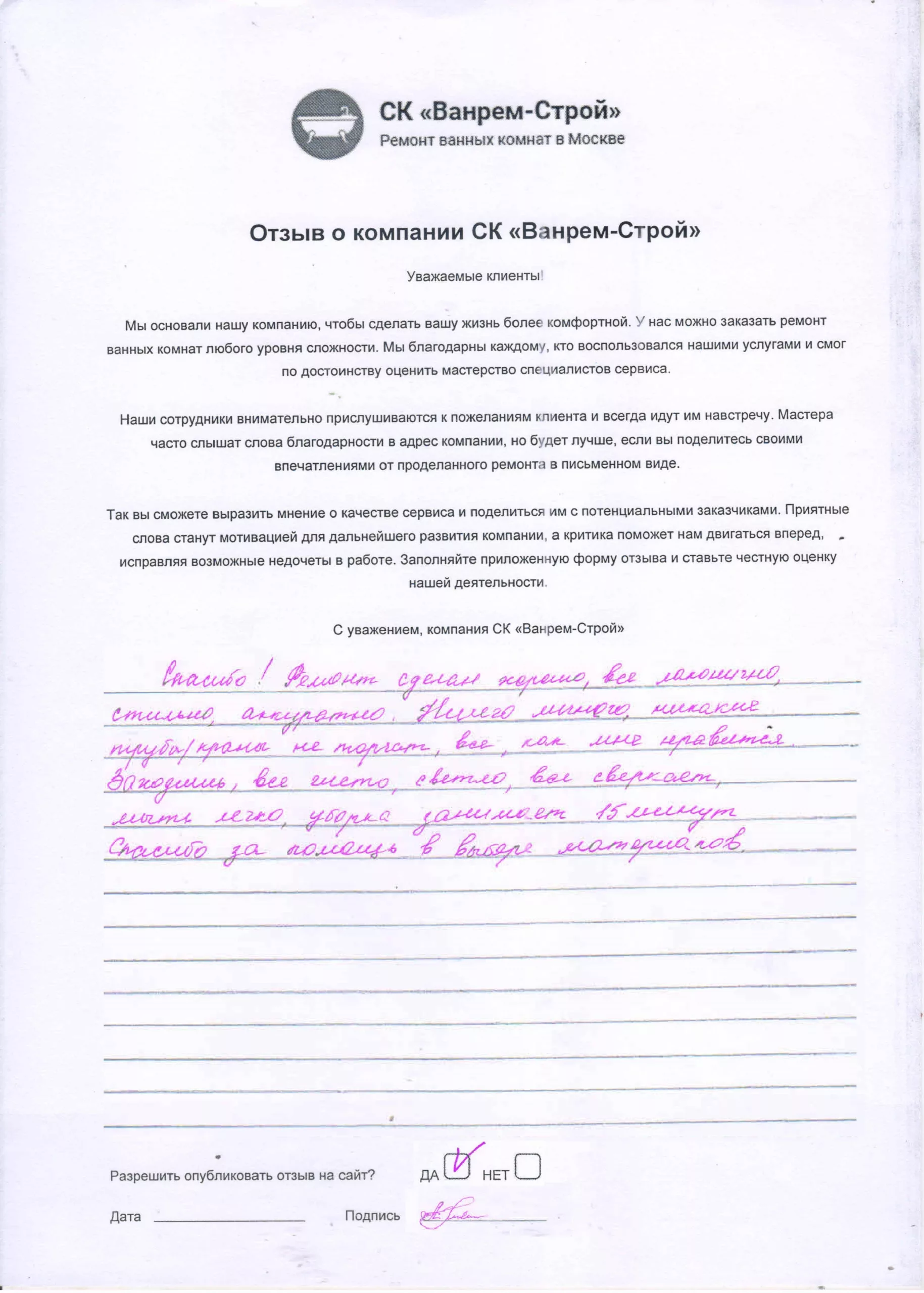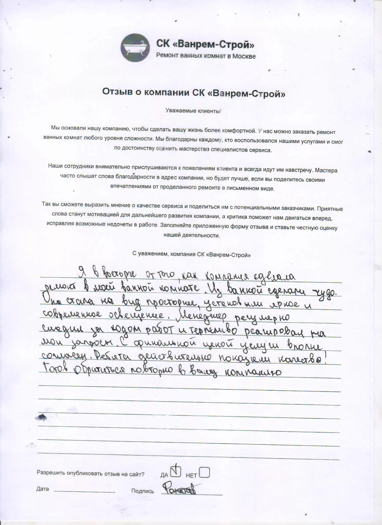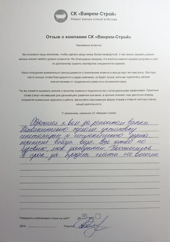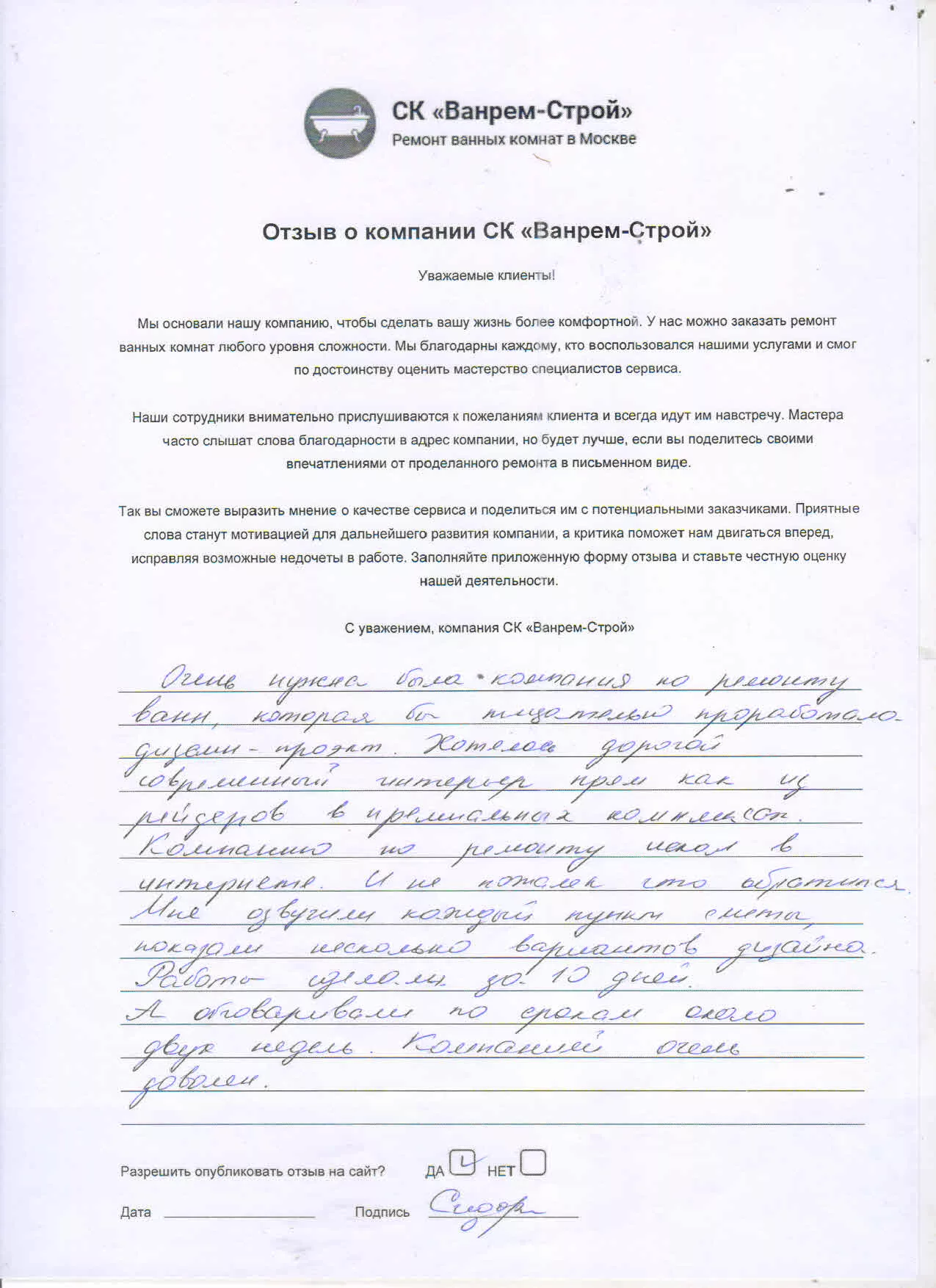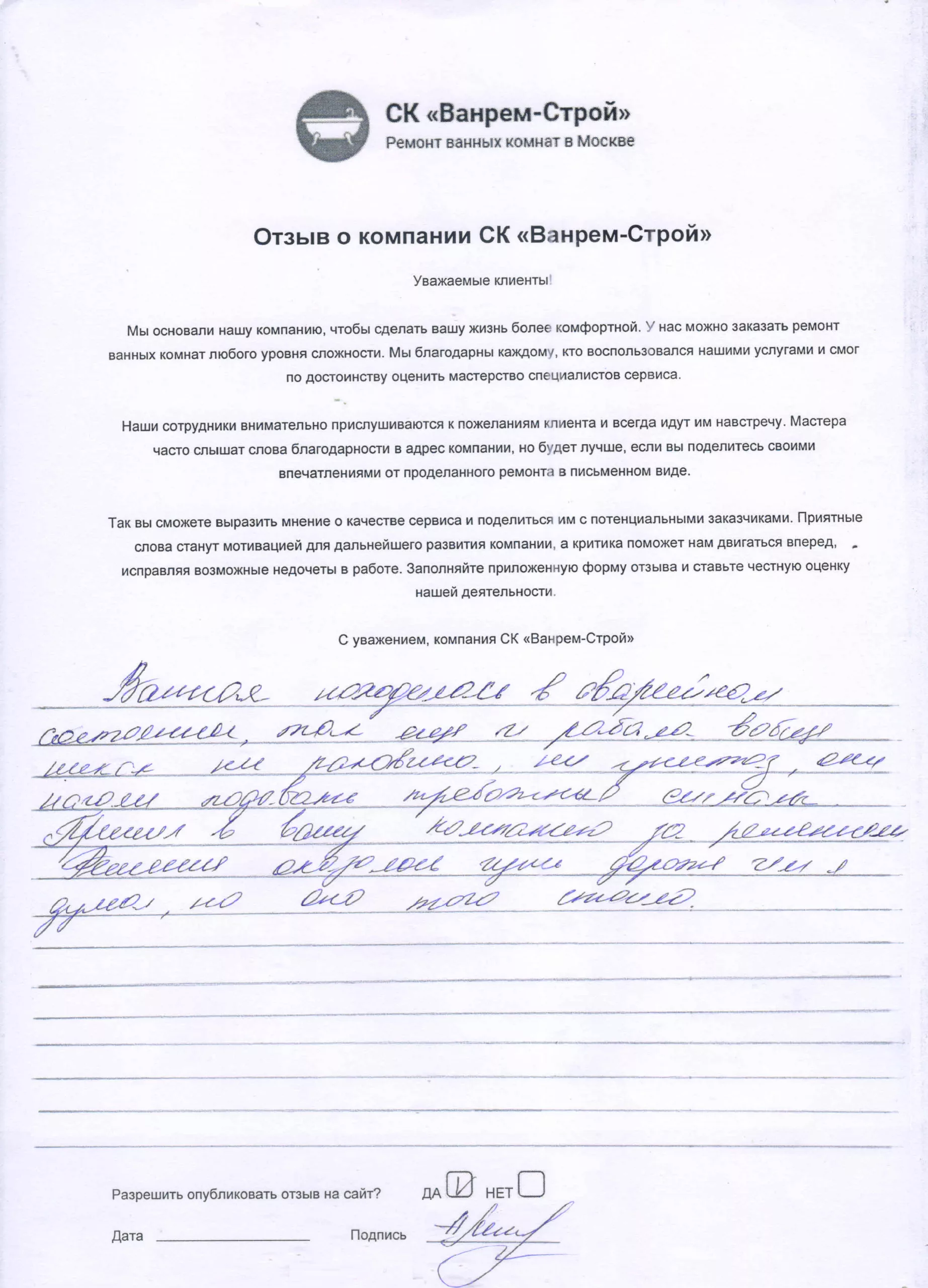 Реальные заказчики дают объективную оценку комплексной работы коллектива сотрудников СК «Ванрем-Строй». Для получения достоверной информации о качестве предоставляемых нами услуг по ремонту ванных комнат, санузлов и туалетов, изучите отзывы клиентов нашей компании.
