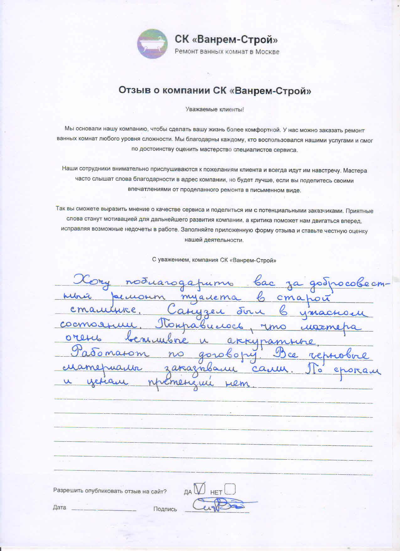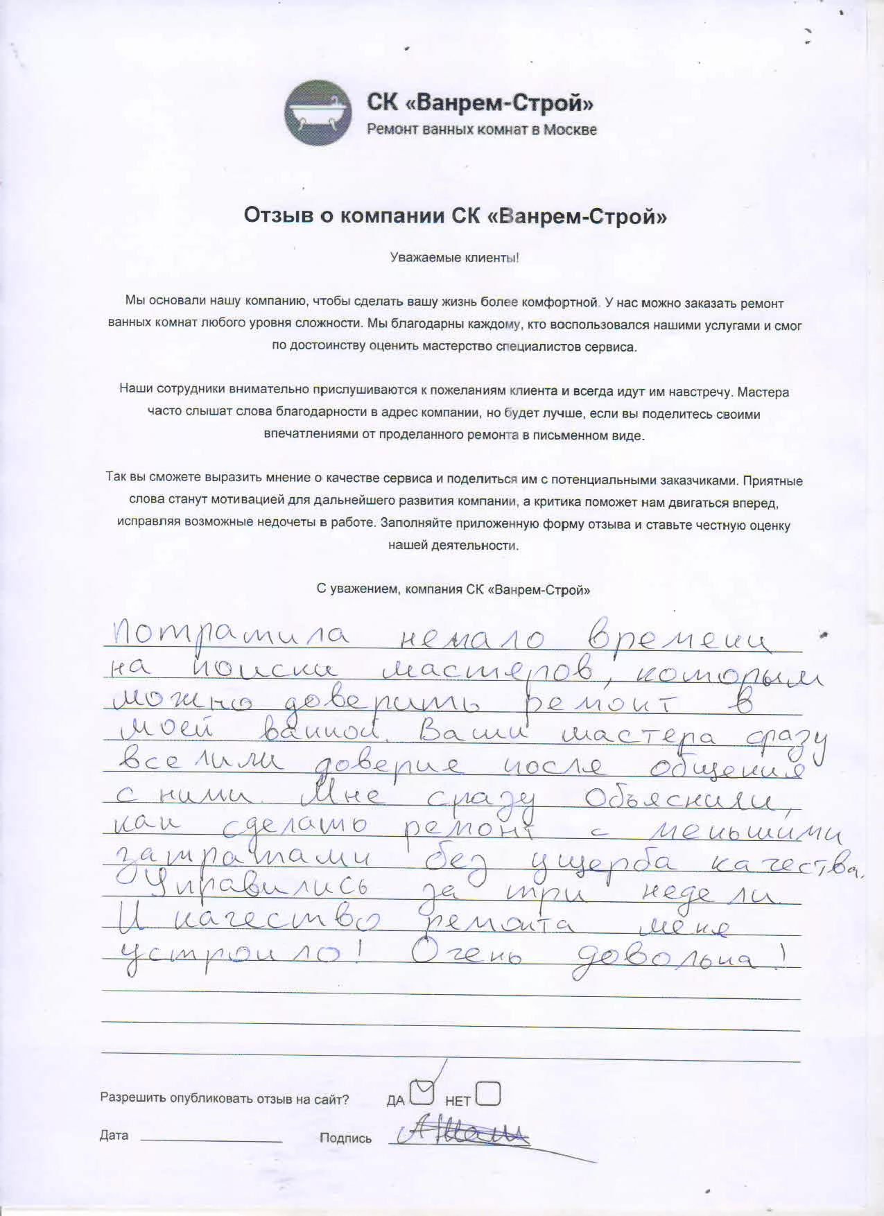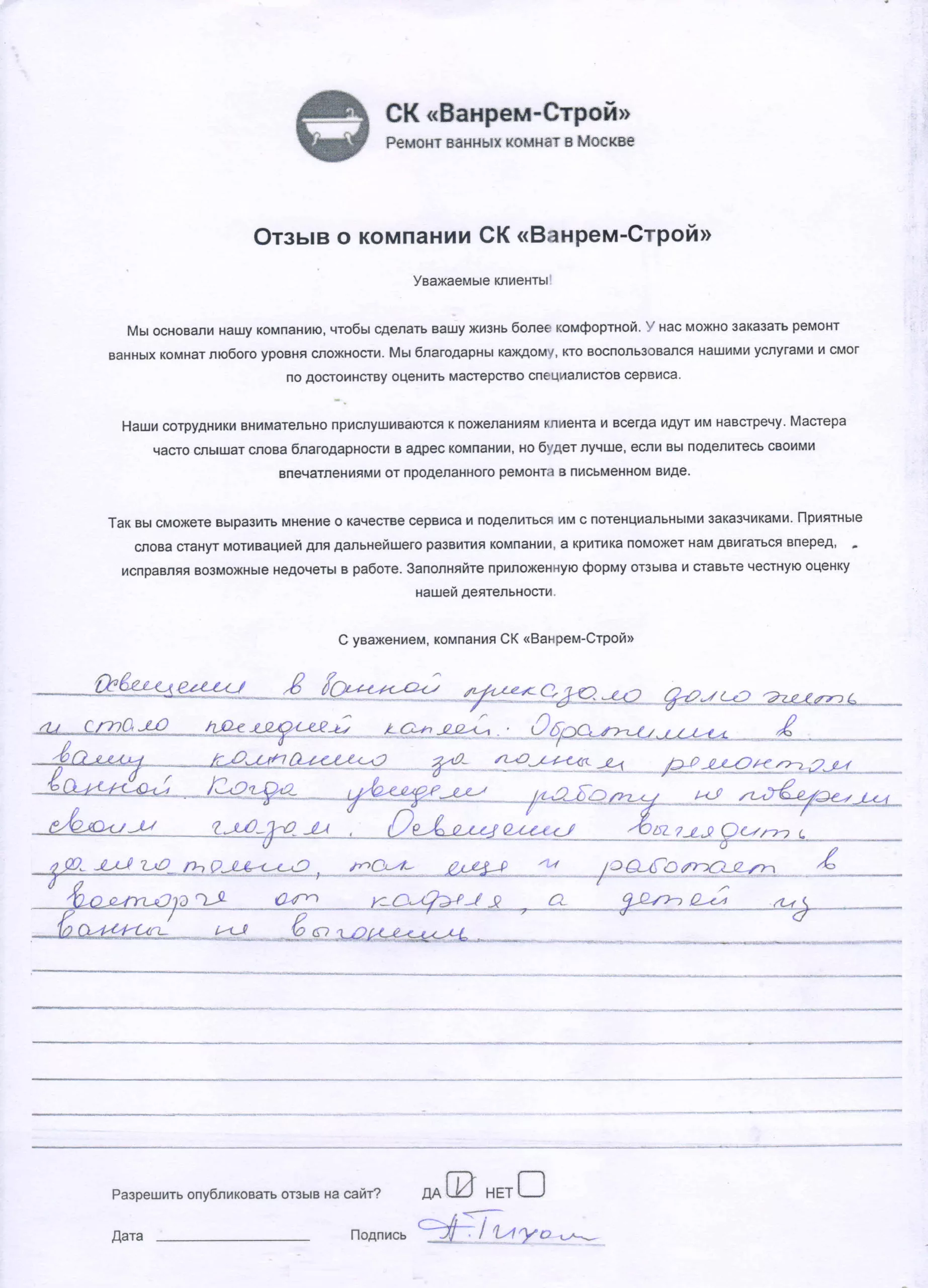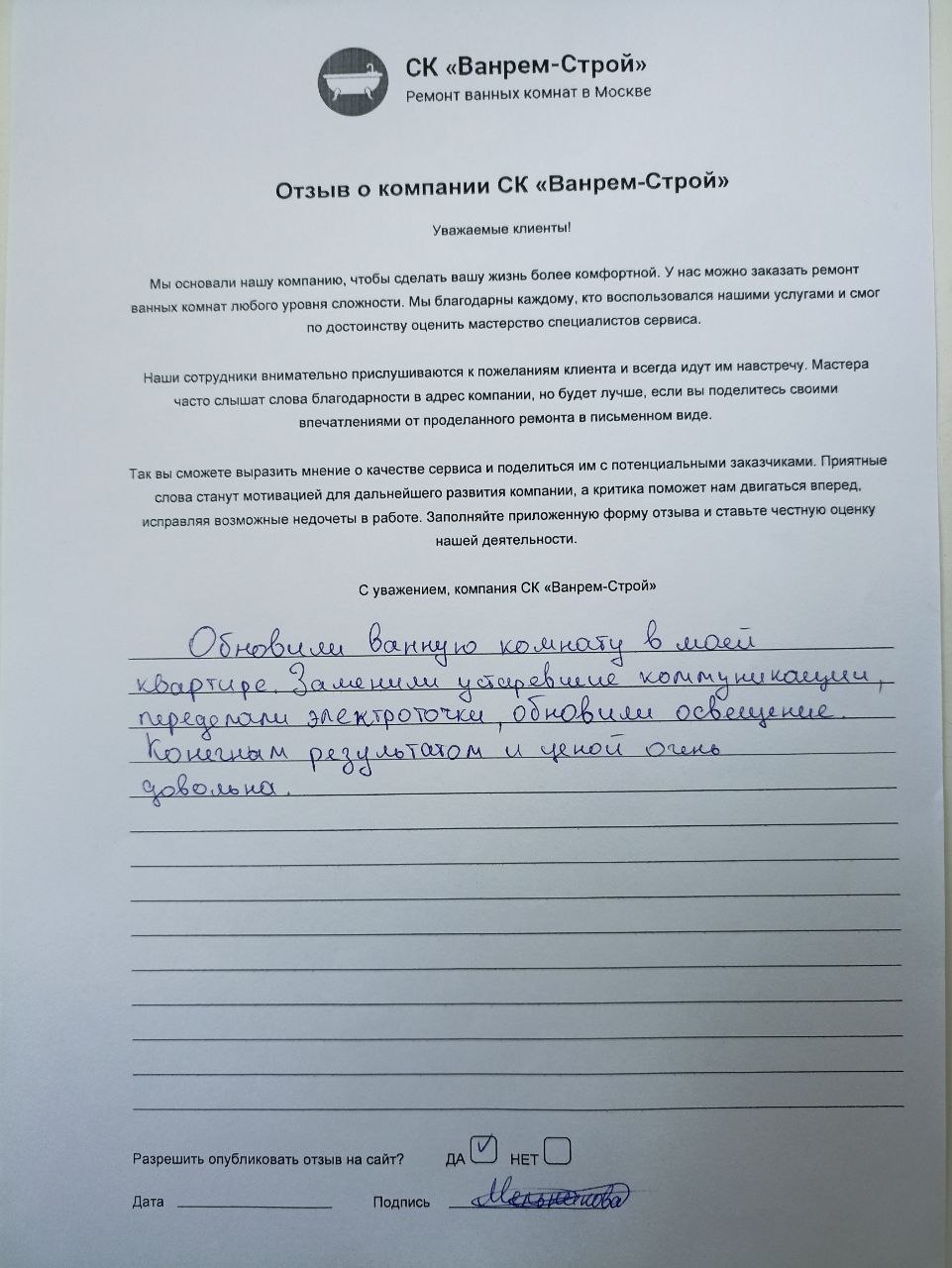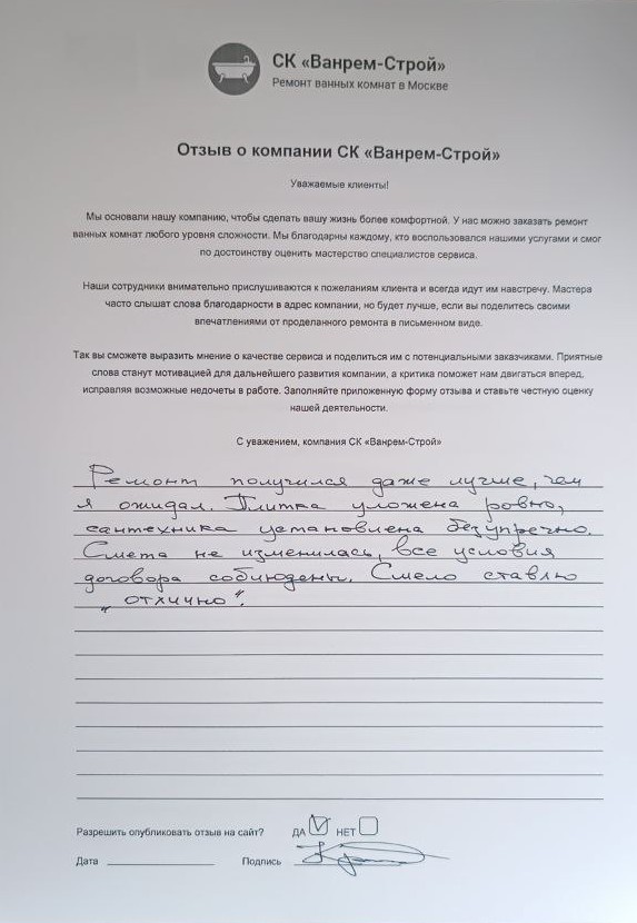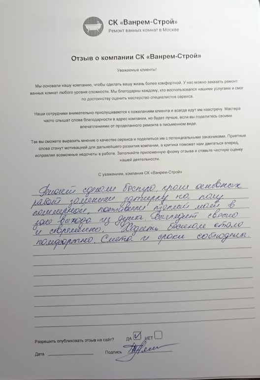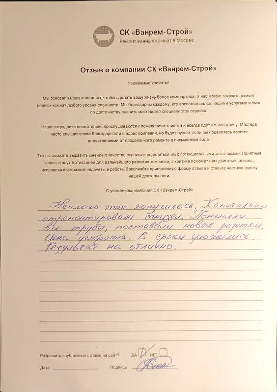 Реальные заказчики дают объективную оценку комплексной работы коллектива сотрудников СК «Ванрем-Строй». Для получения достоверной информации о качестве предоставляемых нами услуг по ремонту ванных комнат, санузлов и туалетов, изучите отзывы клиентов нашей компании.