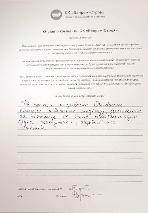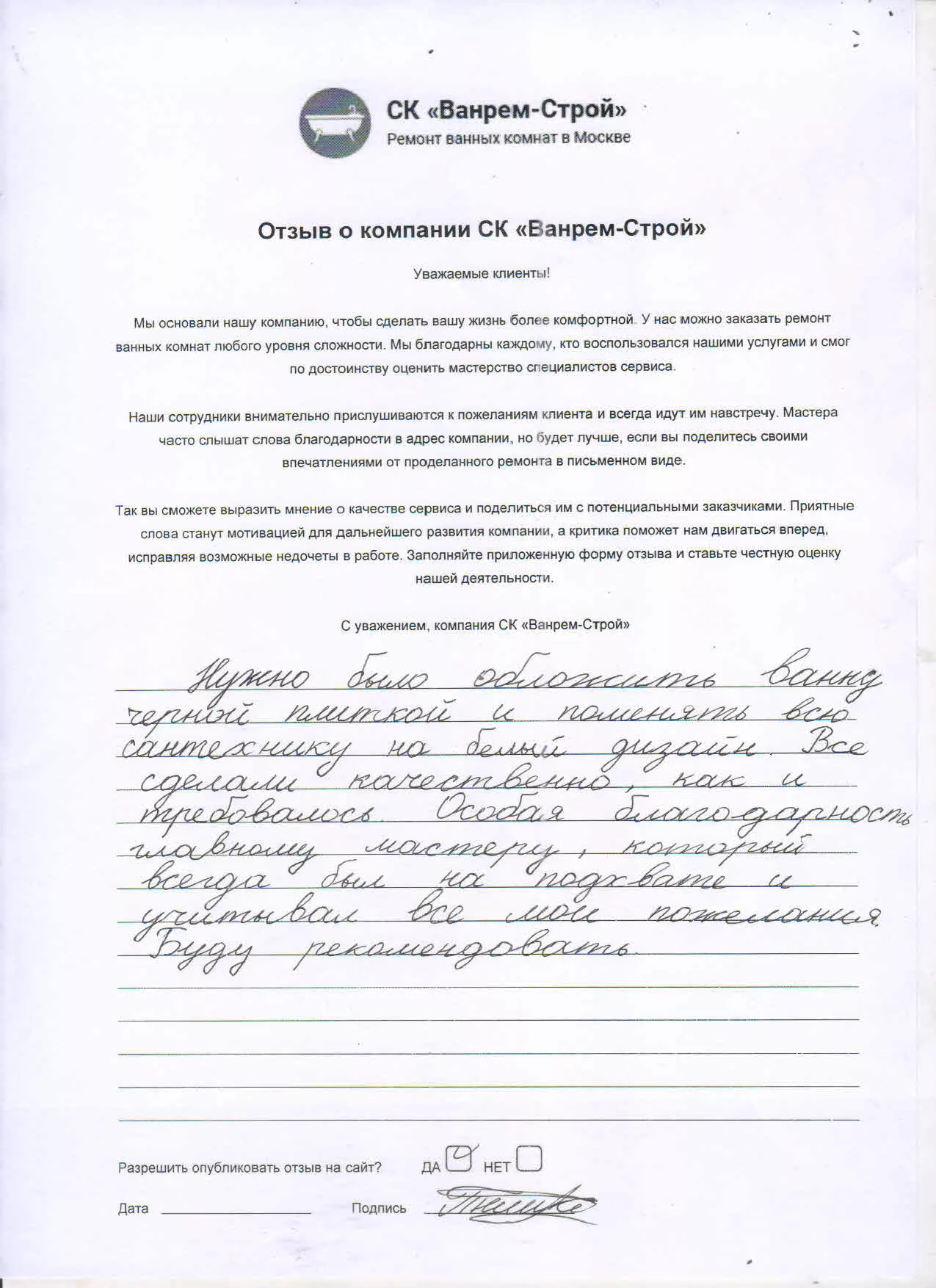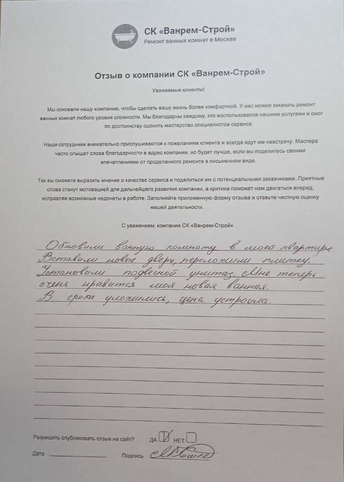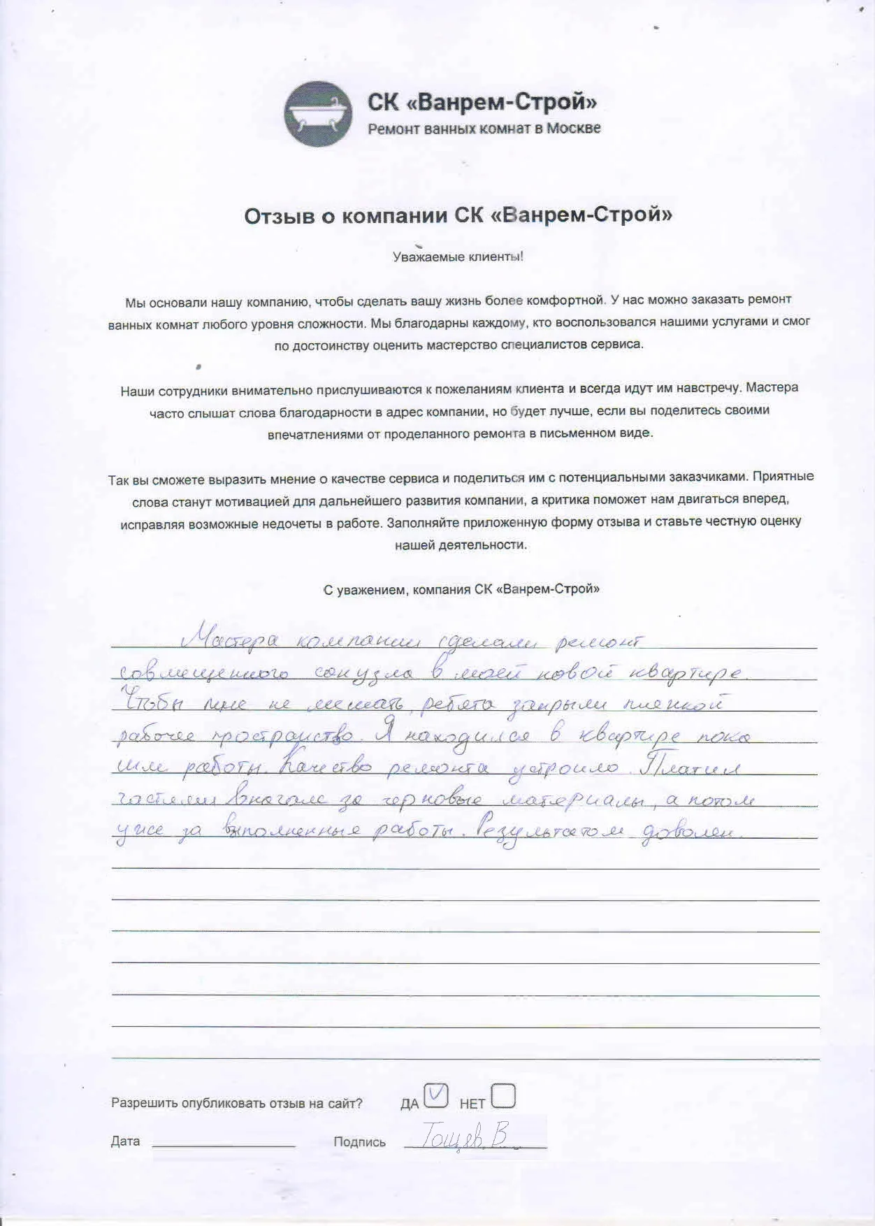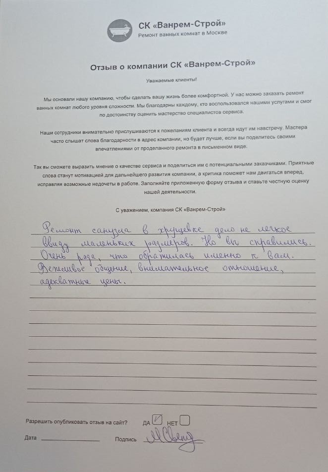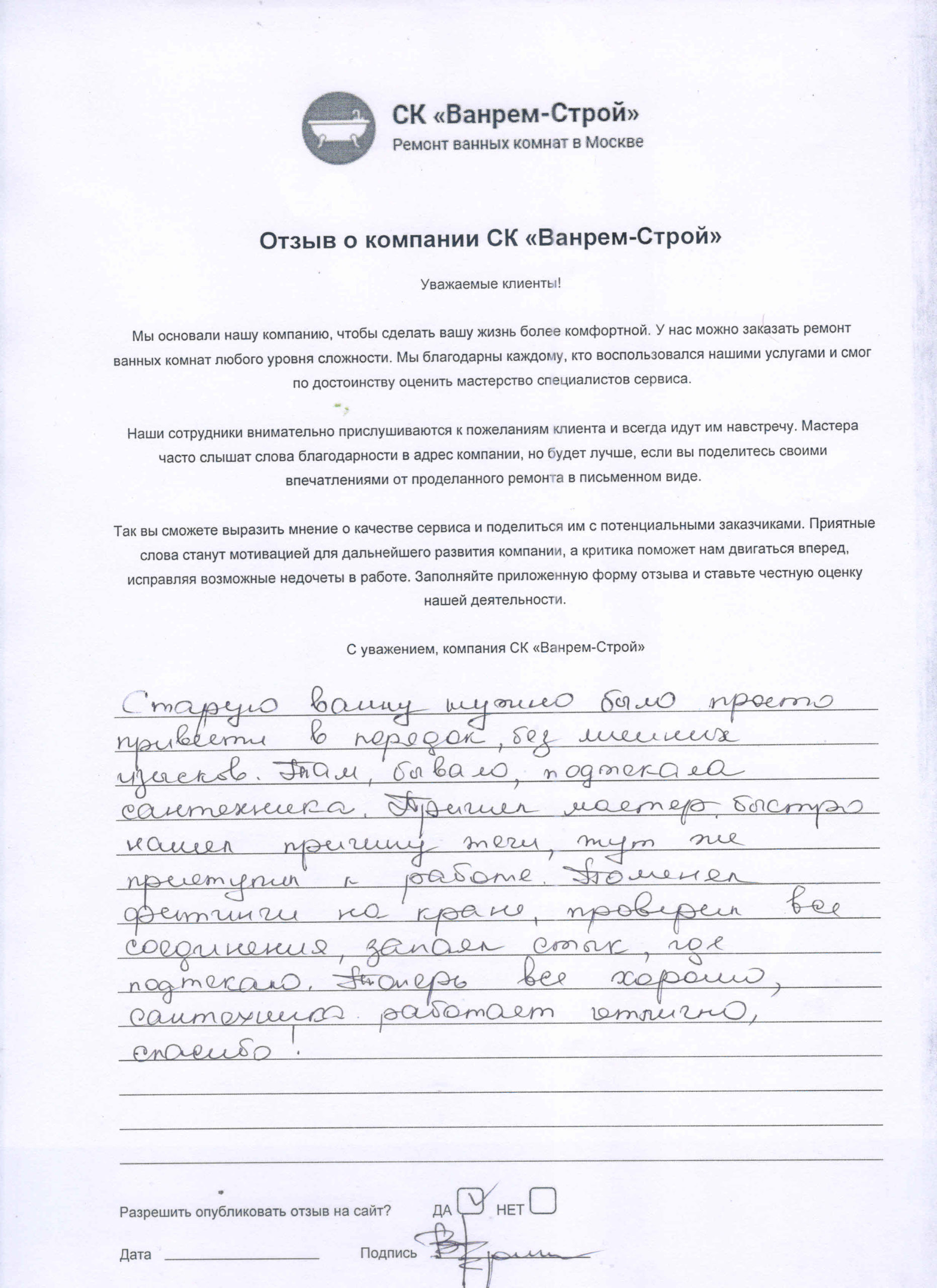 Реальные заказчики дают объективную оценку комплексной работы коллектива сотрудников СК «Ванрем-Строй». Для получения достоверной информации о качестве предоставляемых нами услуг по ремонту ванных комнат, санузлов и туалетов, изучите отзывы клиентов нашей компании.