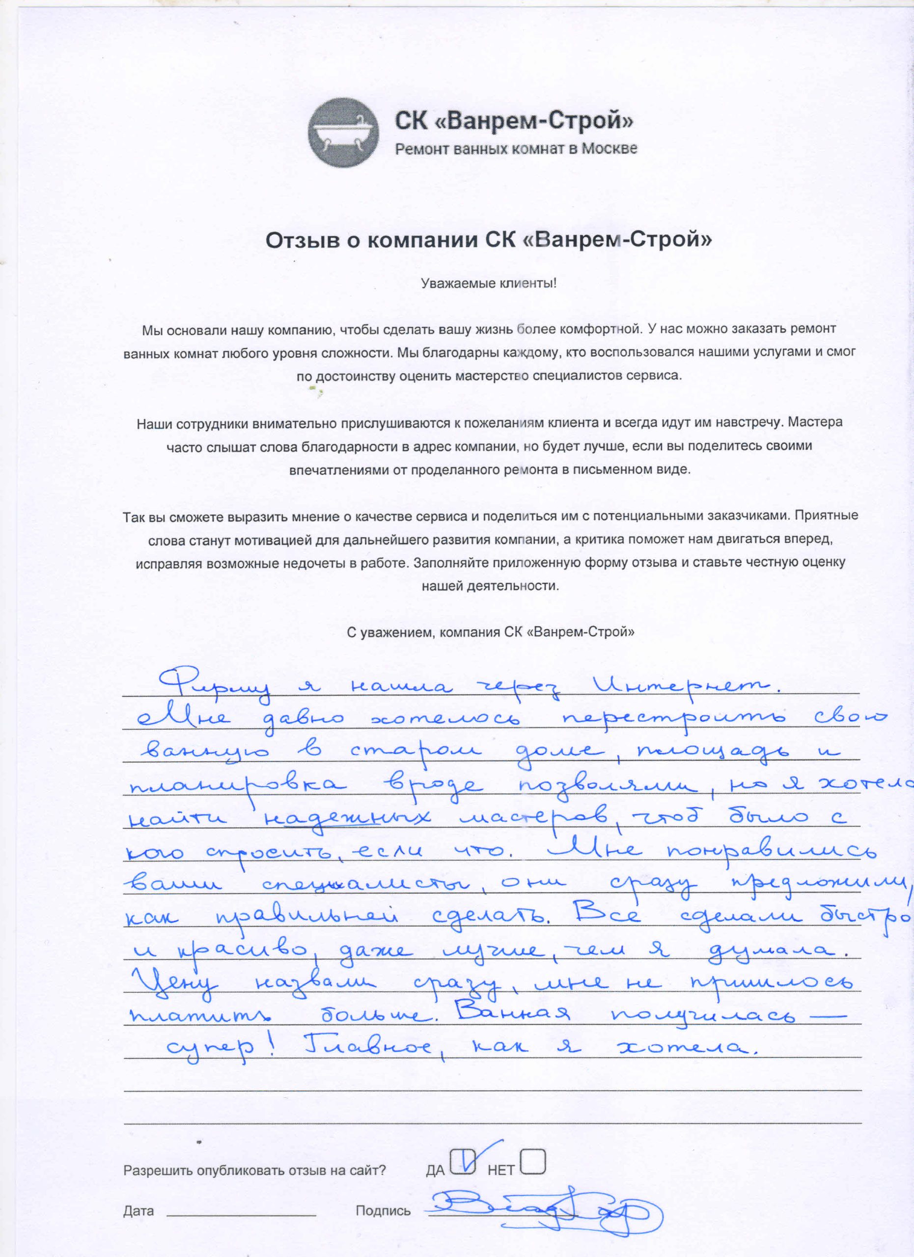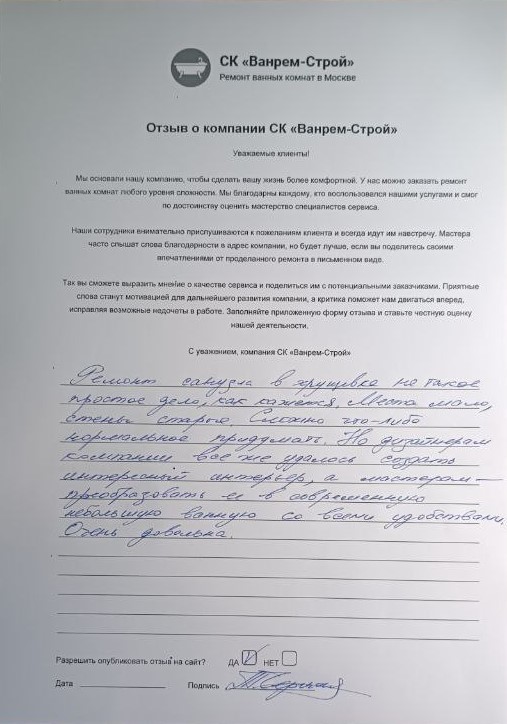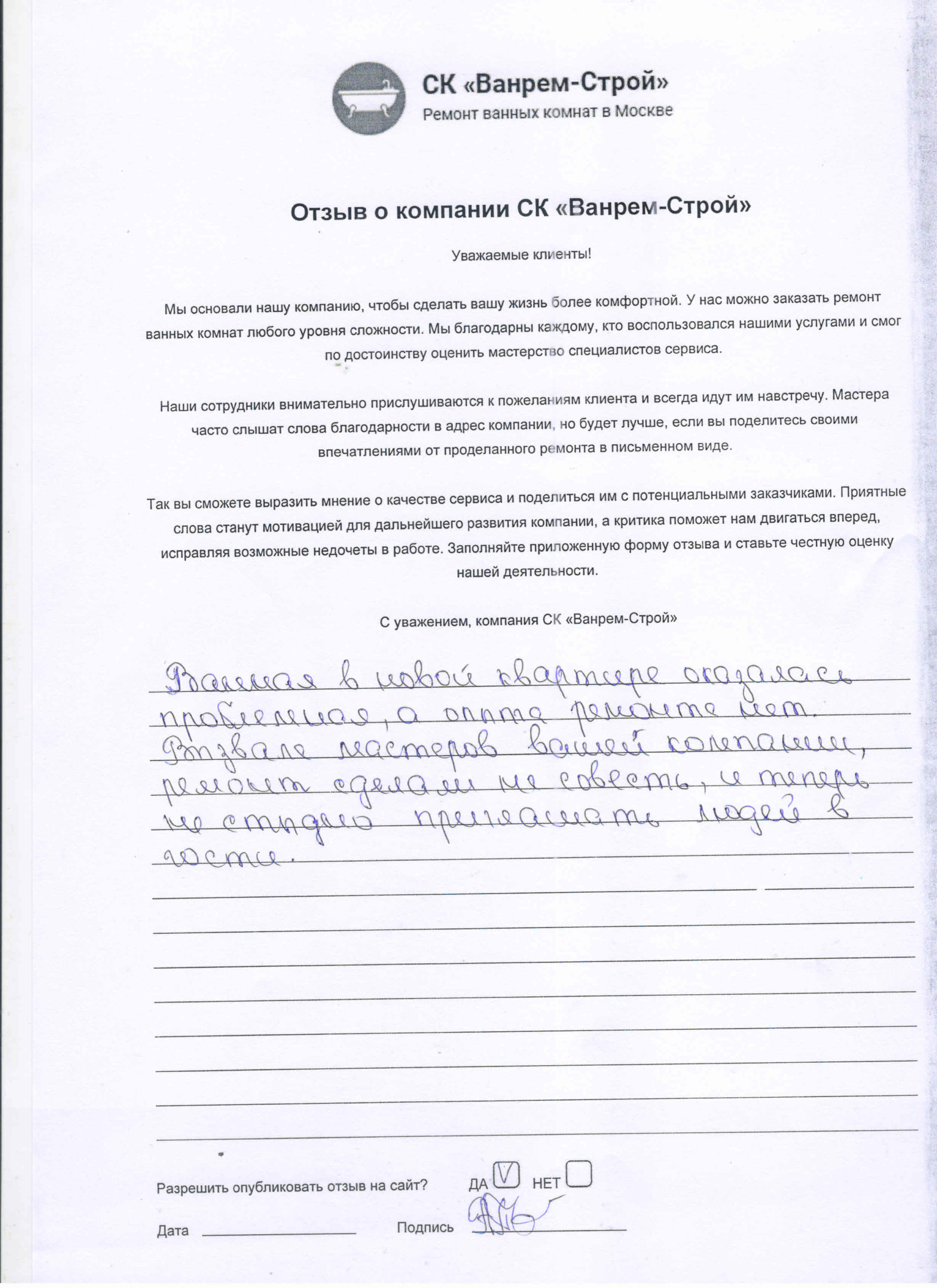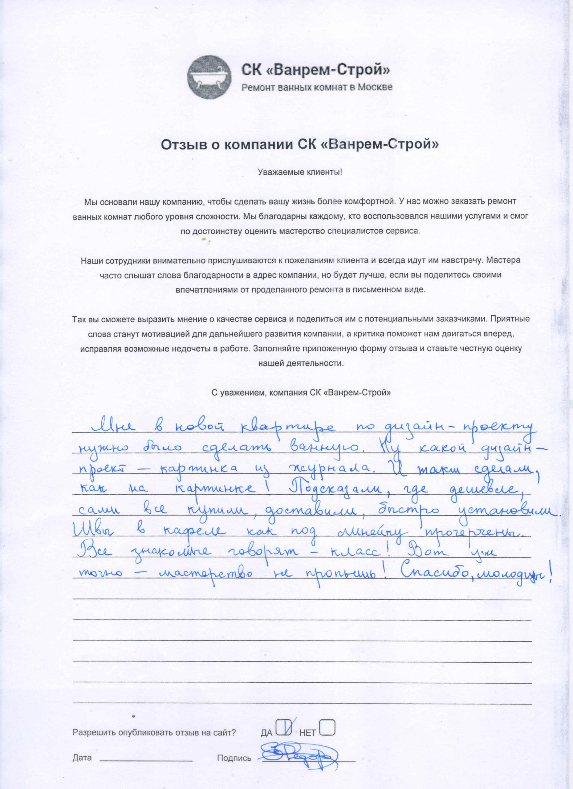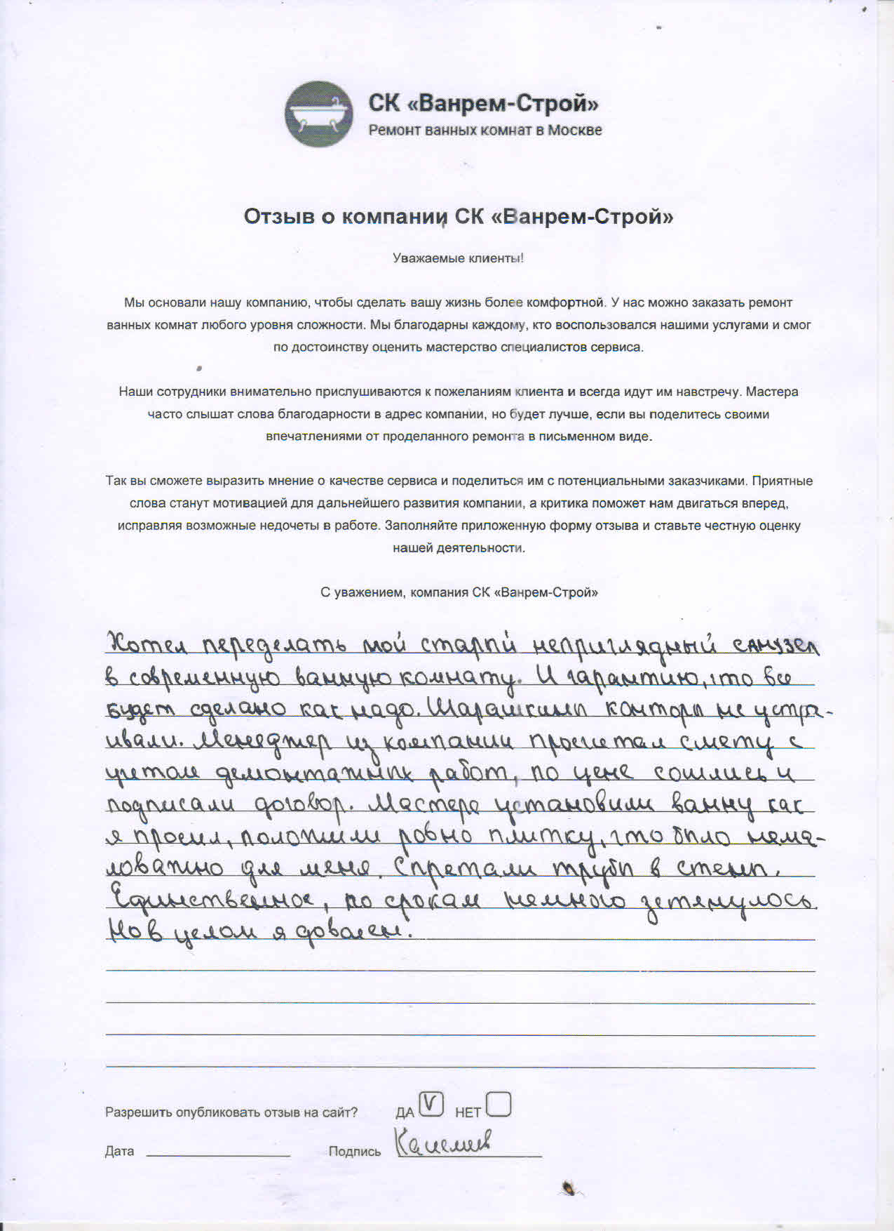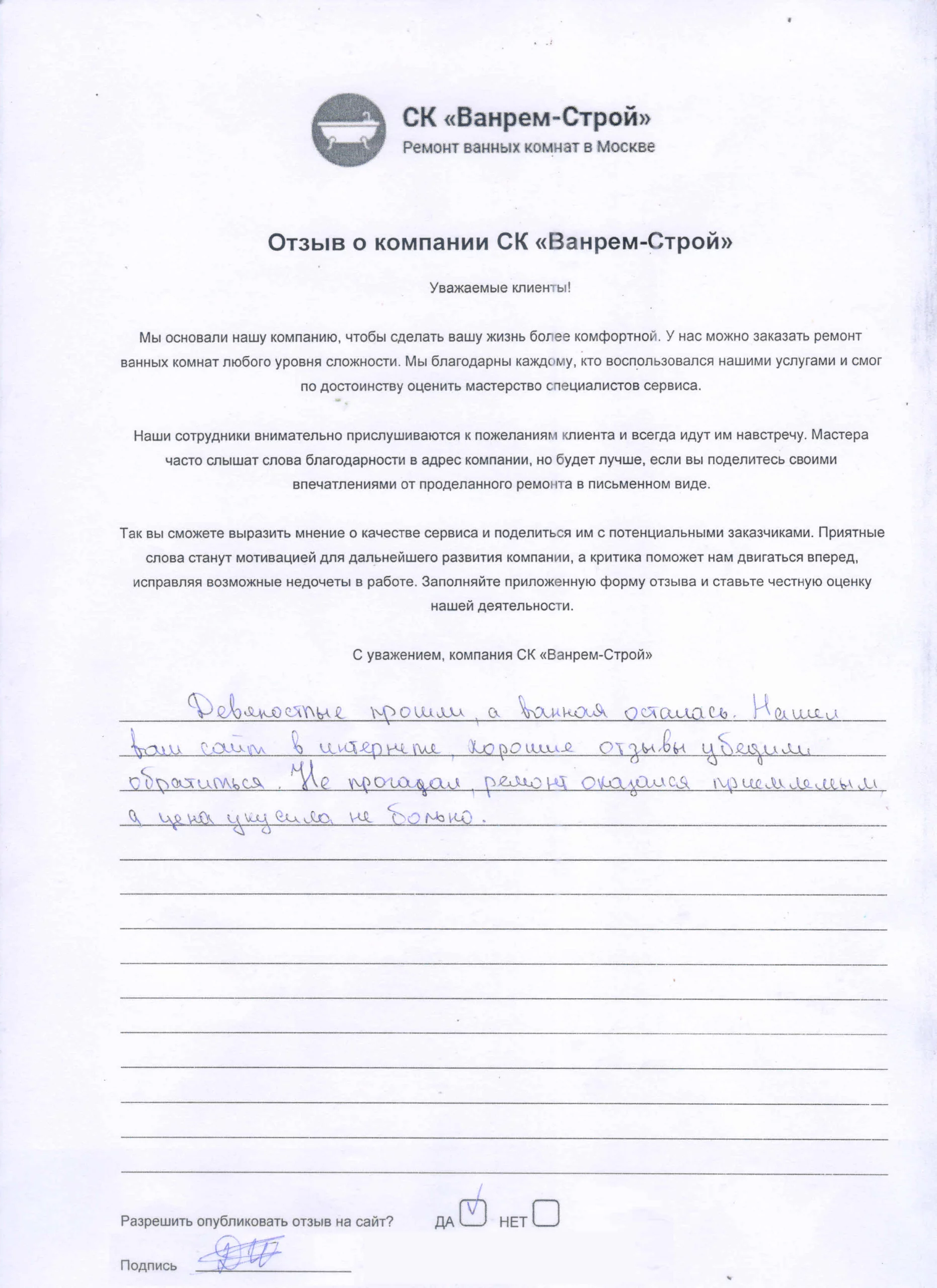 Реальные заказчики дают объективную оценку комплексной работы коллектива сотрудников СК «Ванрем-Строй». Для получения достоверной информации о качестве предоставляемых нами услуг по ремонту ванных комнат, санузлов и туалетов, изучите отзывы клиентов нашей компании.