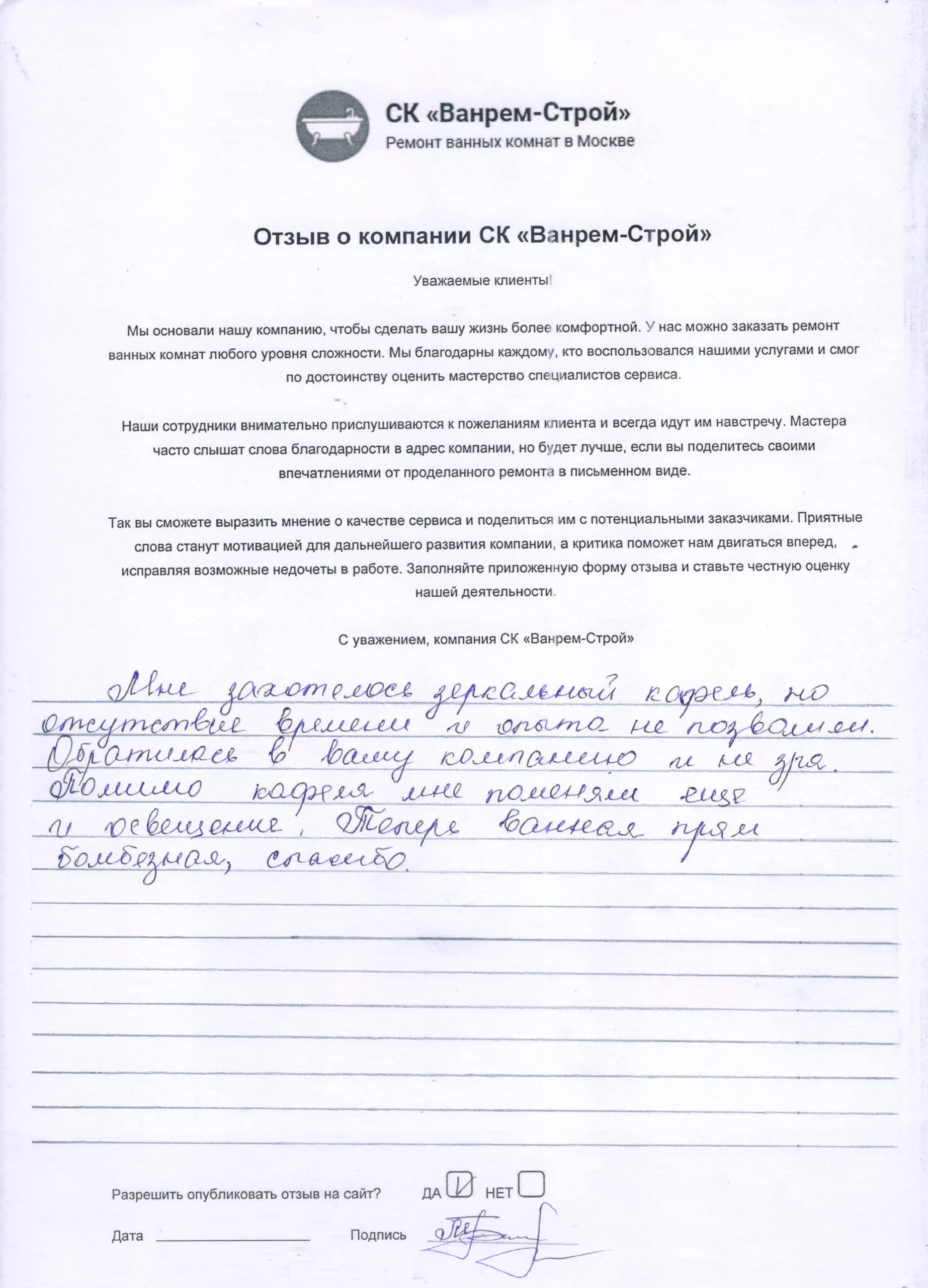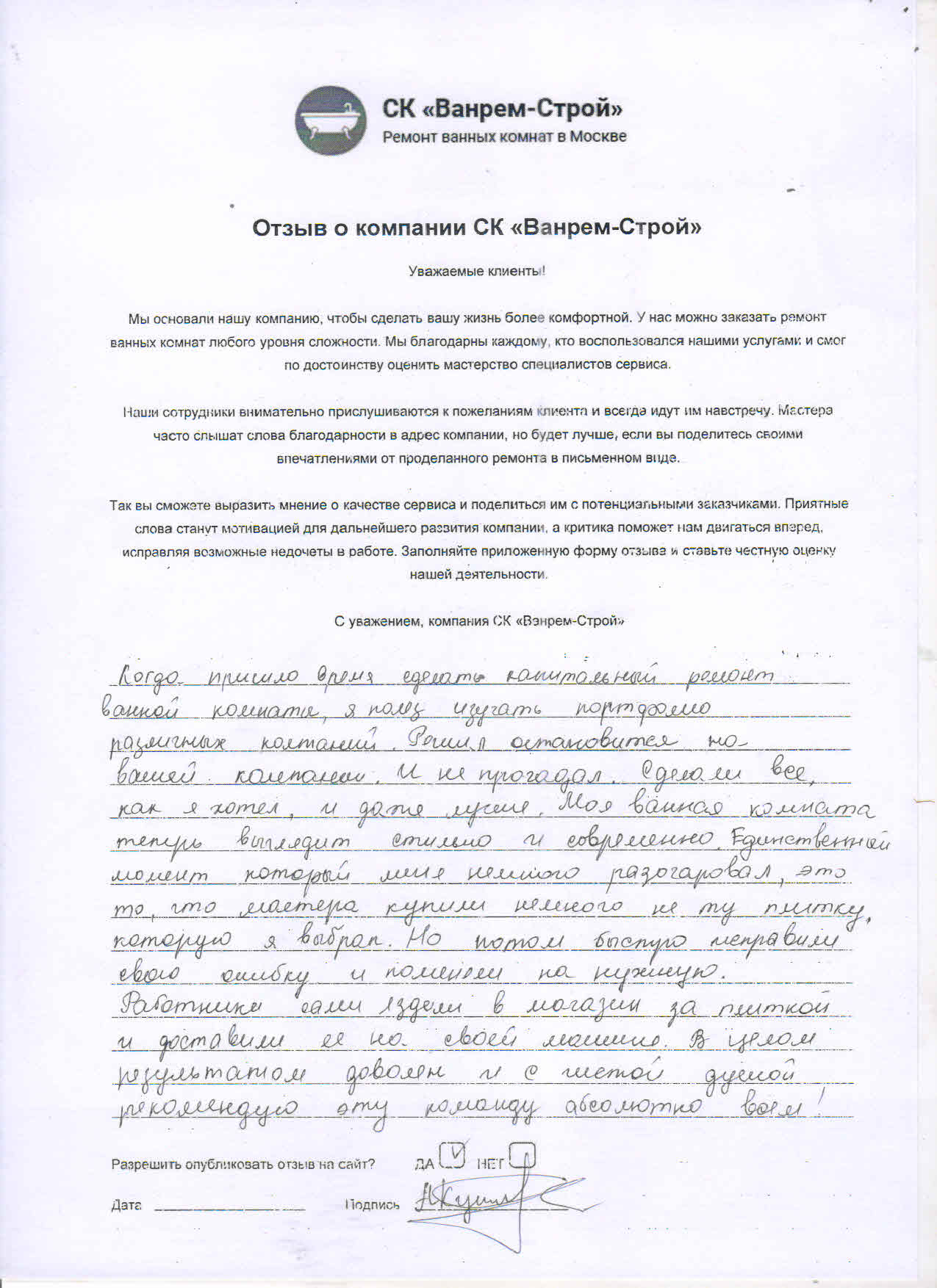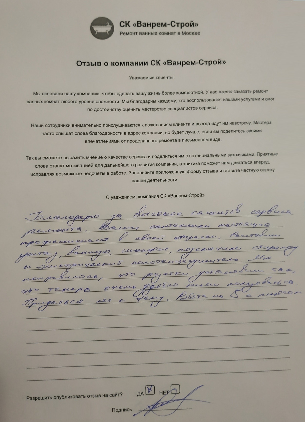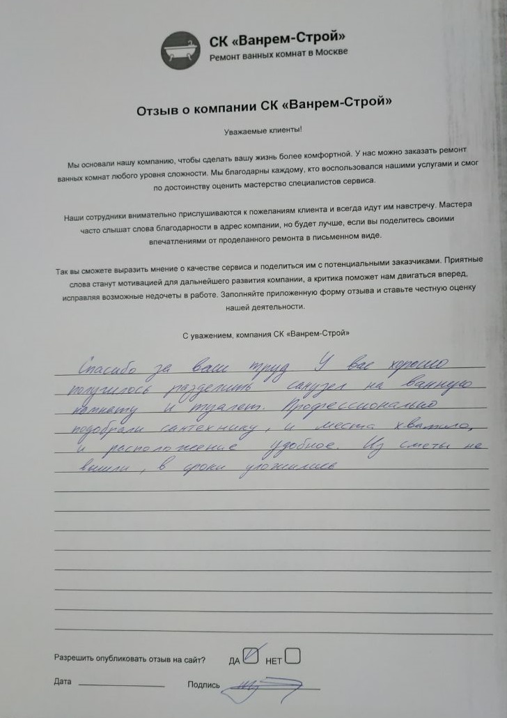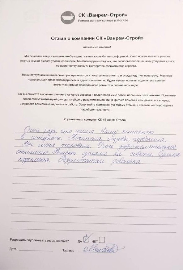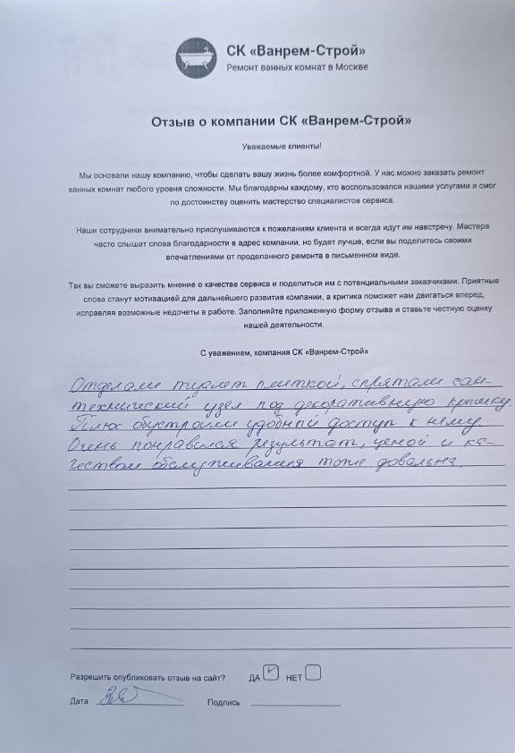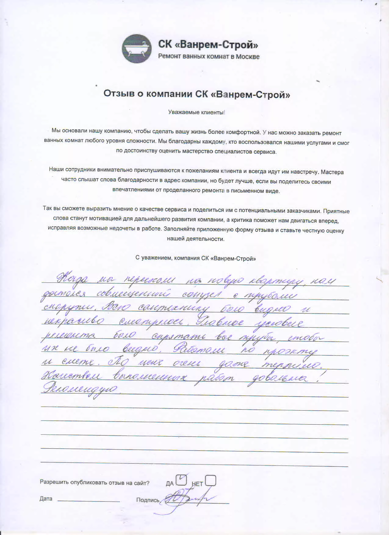 Реальные заказчики дают объективную оценку комплексной работы коллектива сотрудников СК «Ванрем-Строй». Для получения достоверной информации о качестве предоставляемых нами услуг по ремонту ванных комнат, санузлов и туалетов, изучите отзывы клиентов нашей компании.