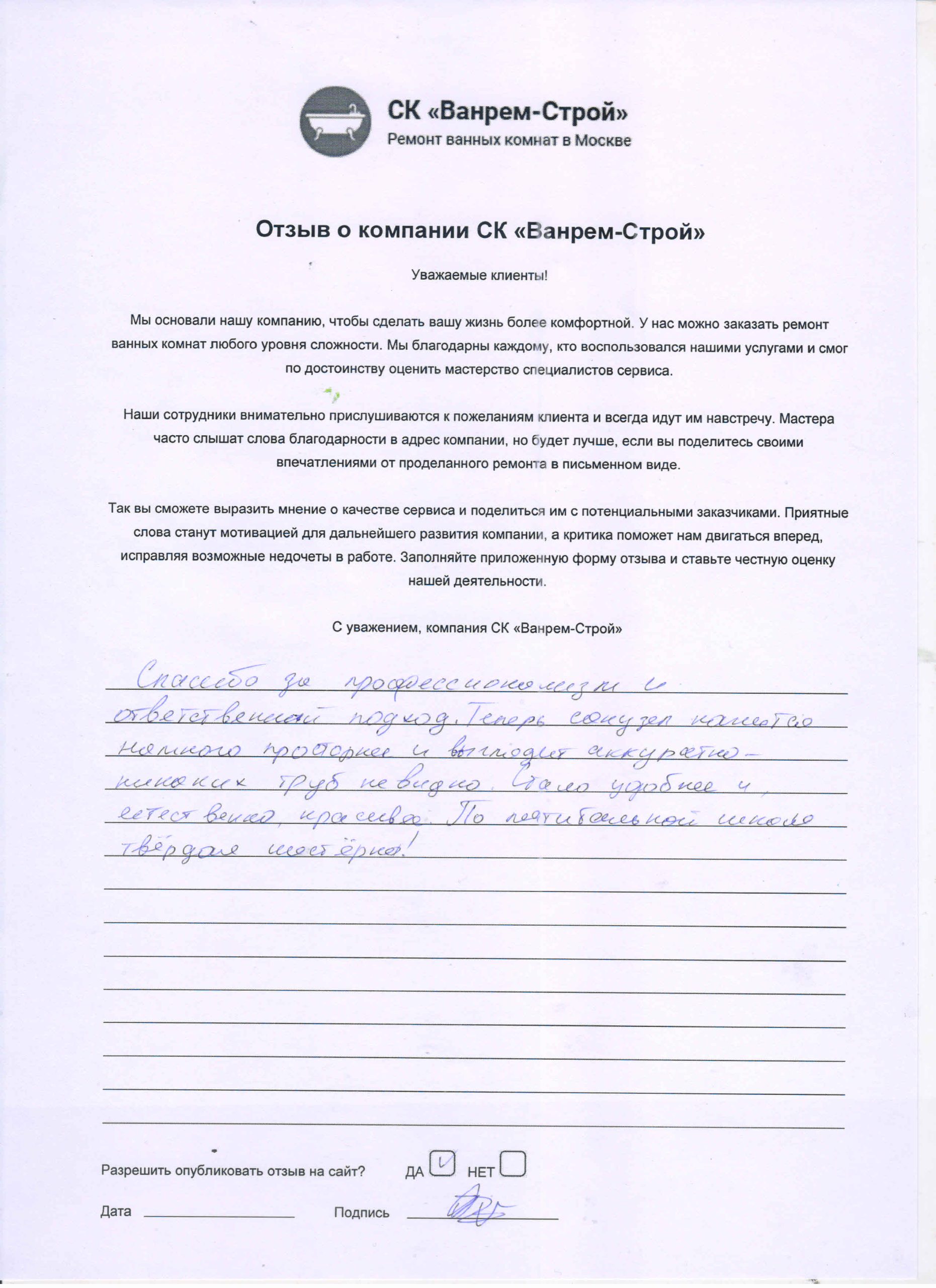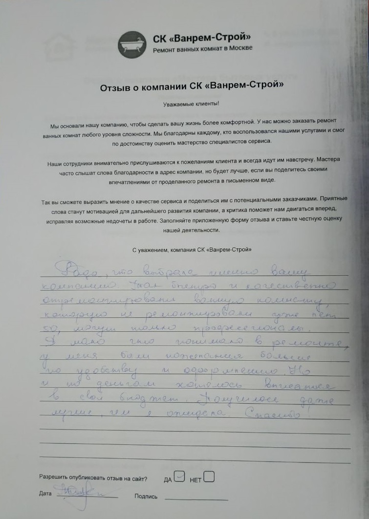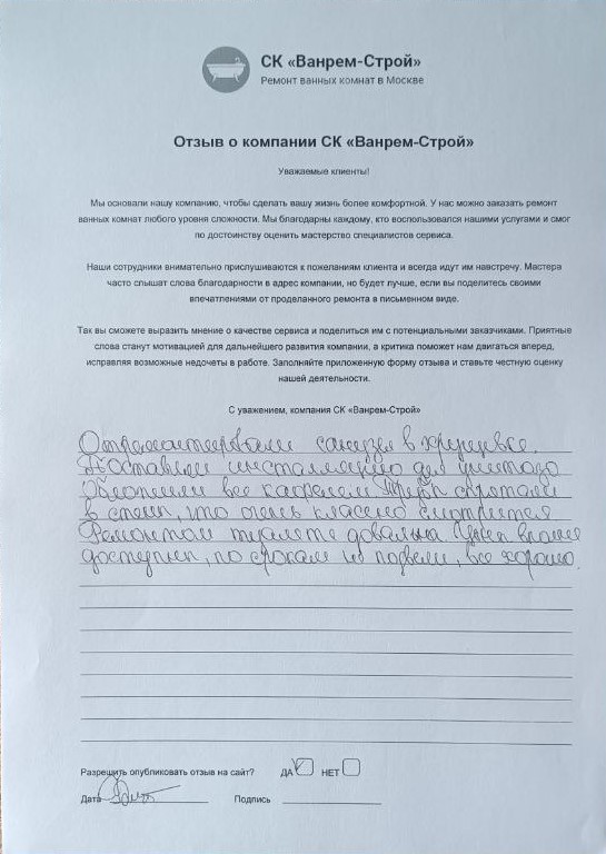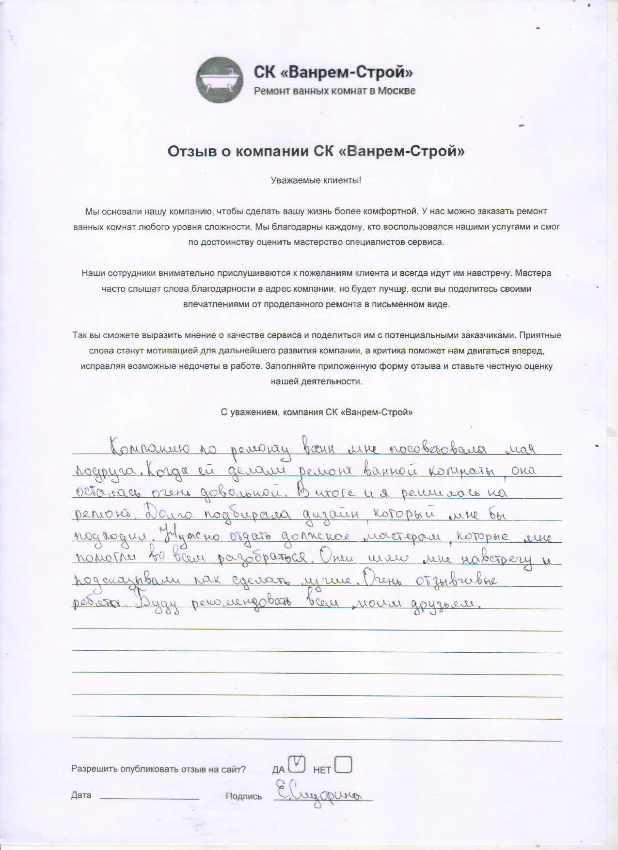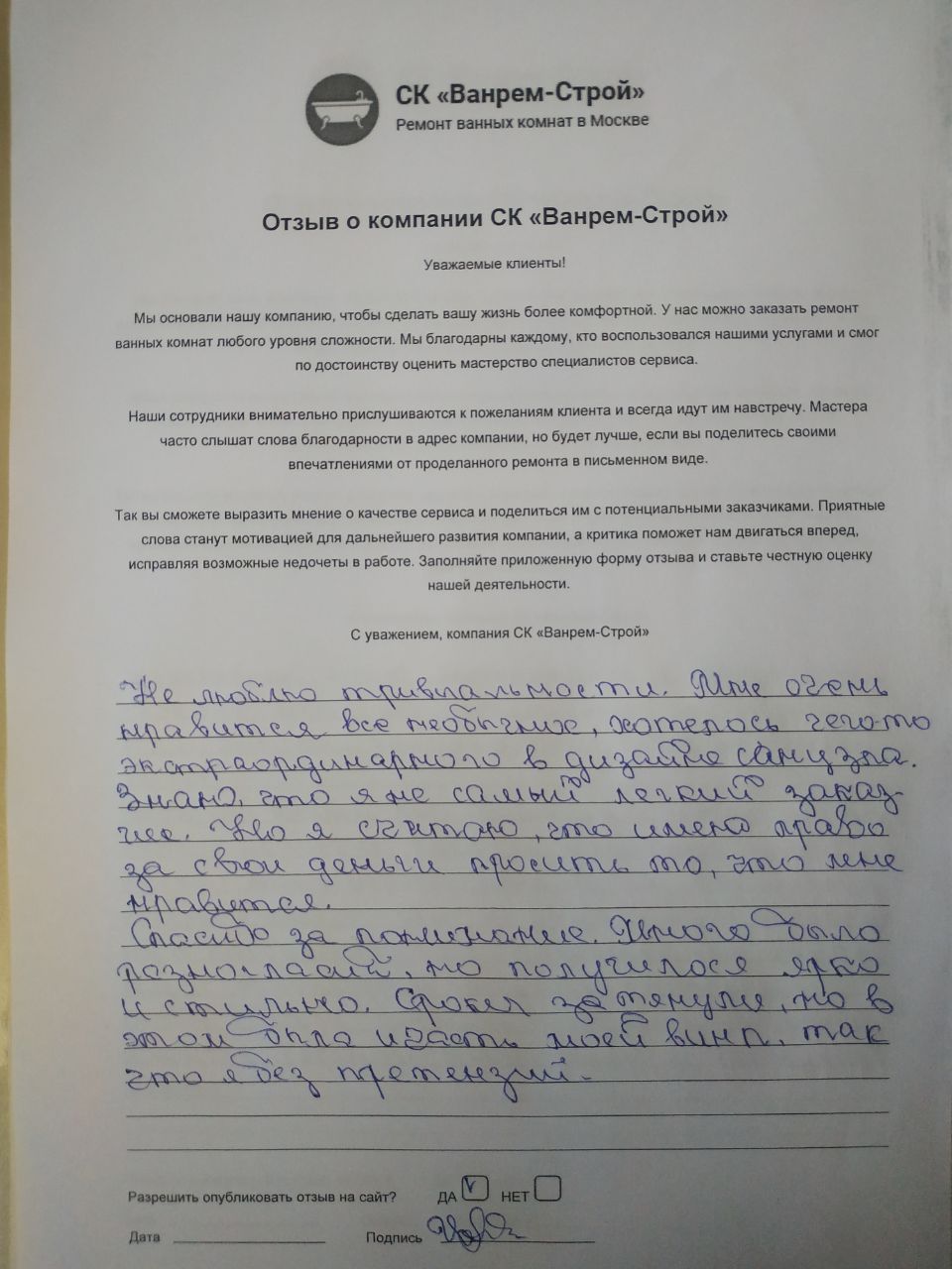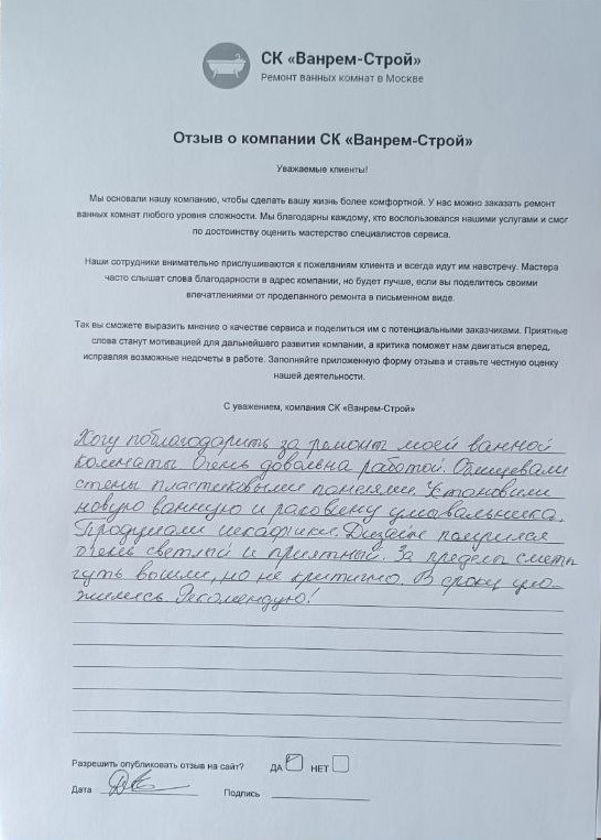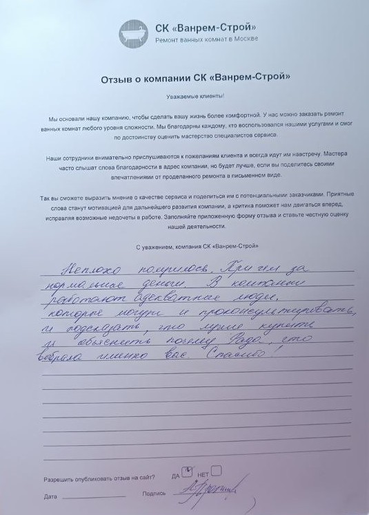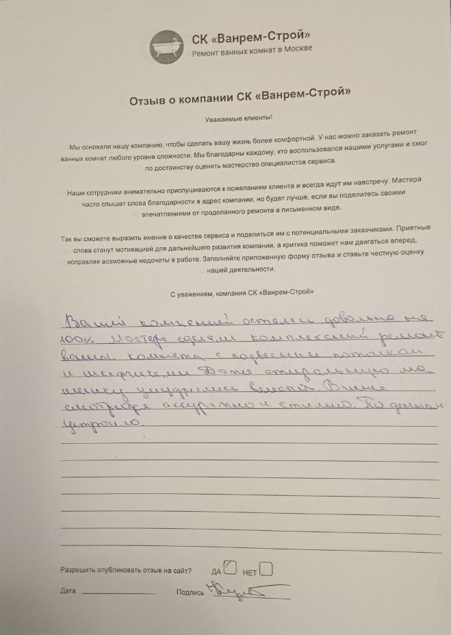 Реальные заказчики дают объективную оценку комплексной работы коллектива сотрудников СК «Ванрем-Строй». Для получения достоверной информации о качестве предоставляемых нами услуг по ремонту ванных комнат, санузлов и туалетов, изучите отзывы клиентов нашей компании.