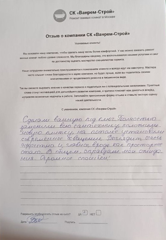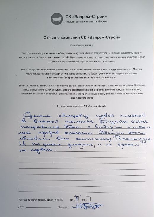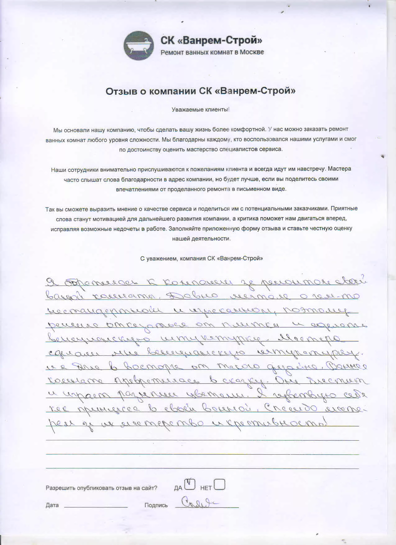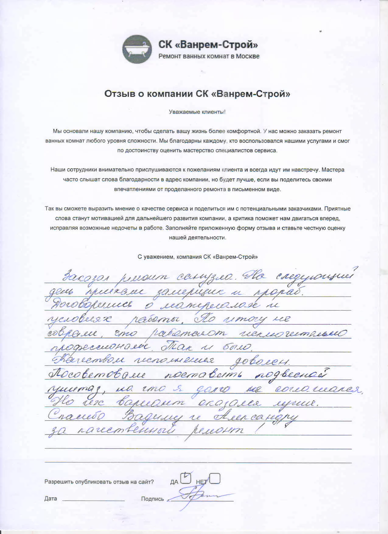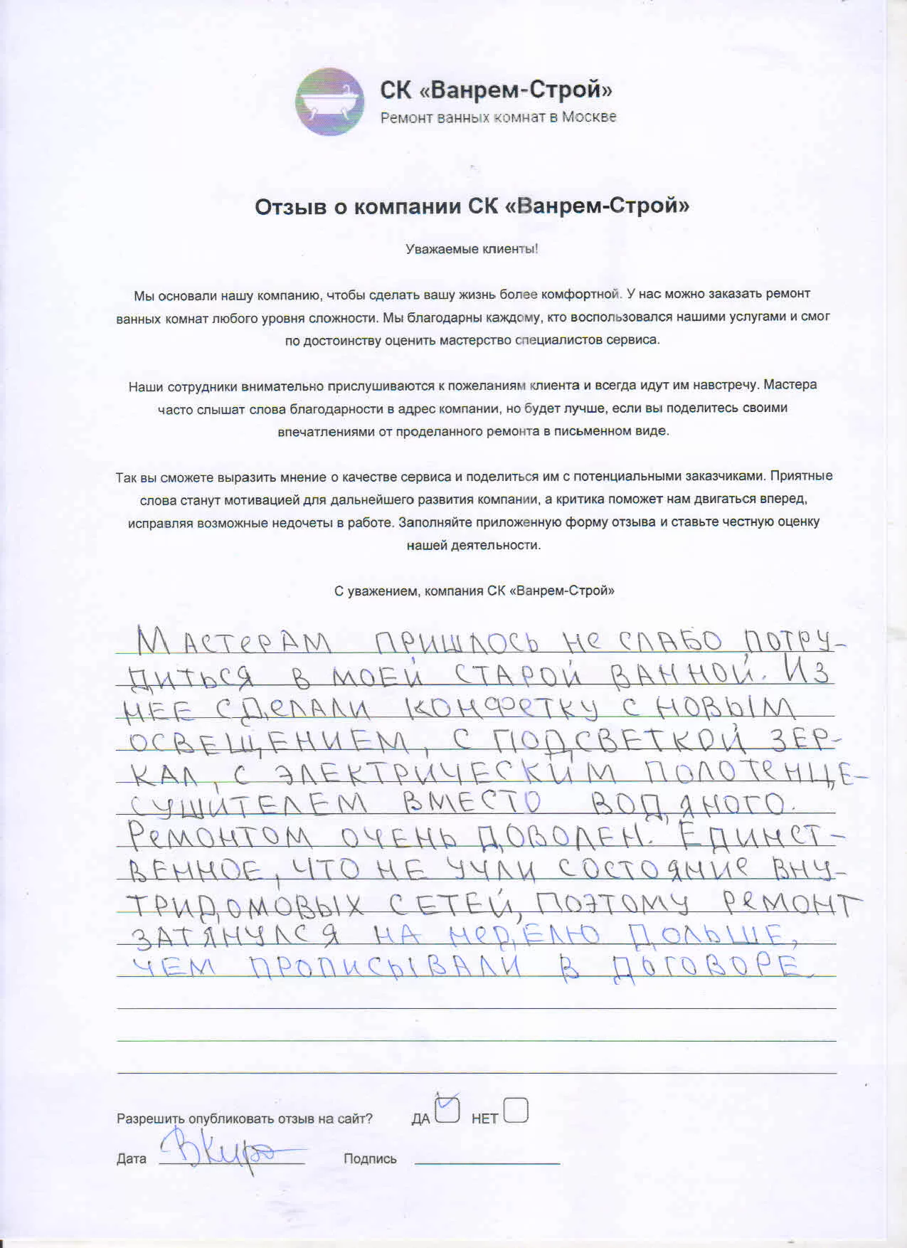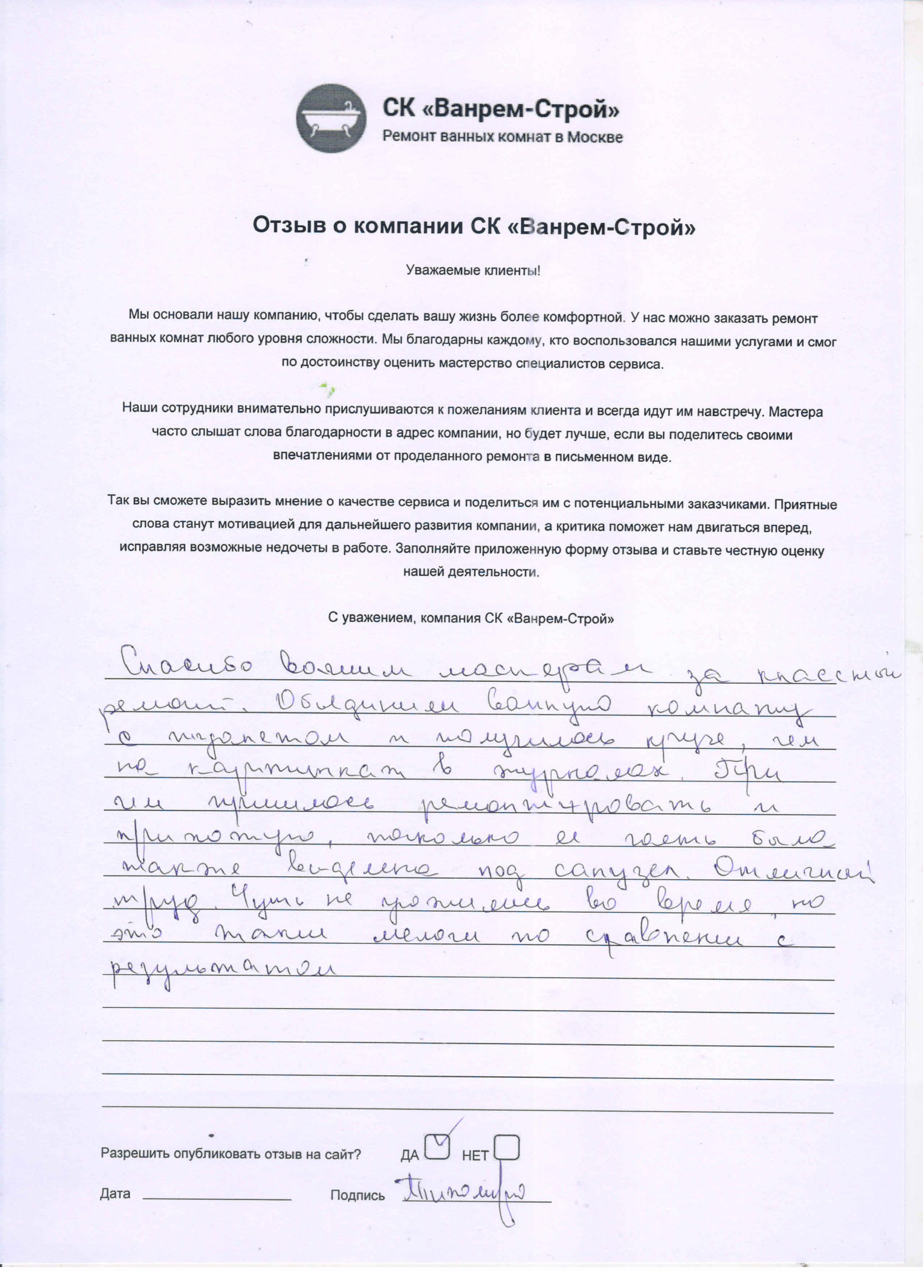 Реальные заказчики дают объективную оценку комплексной работы коллектива сотрудников СК «Ванрем-Строй». Для получения достоверной информации о качестве предоставляемых нами услуг по ремонту ванных комнат, санузлов и туалетов, изучите отзывы клиентов нашей компании.