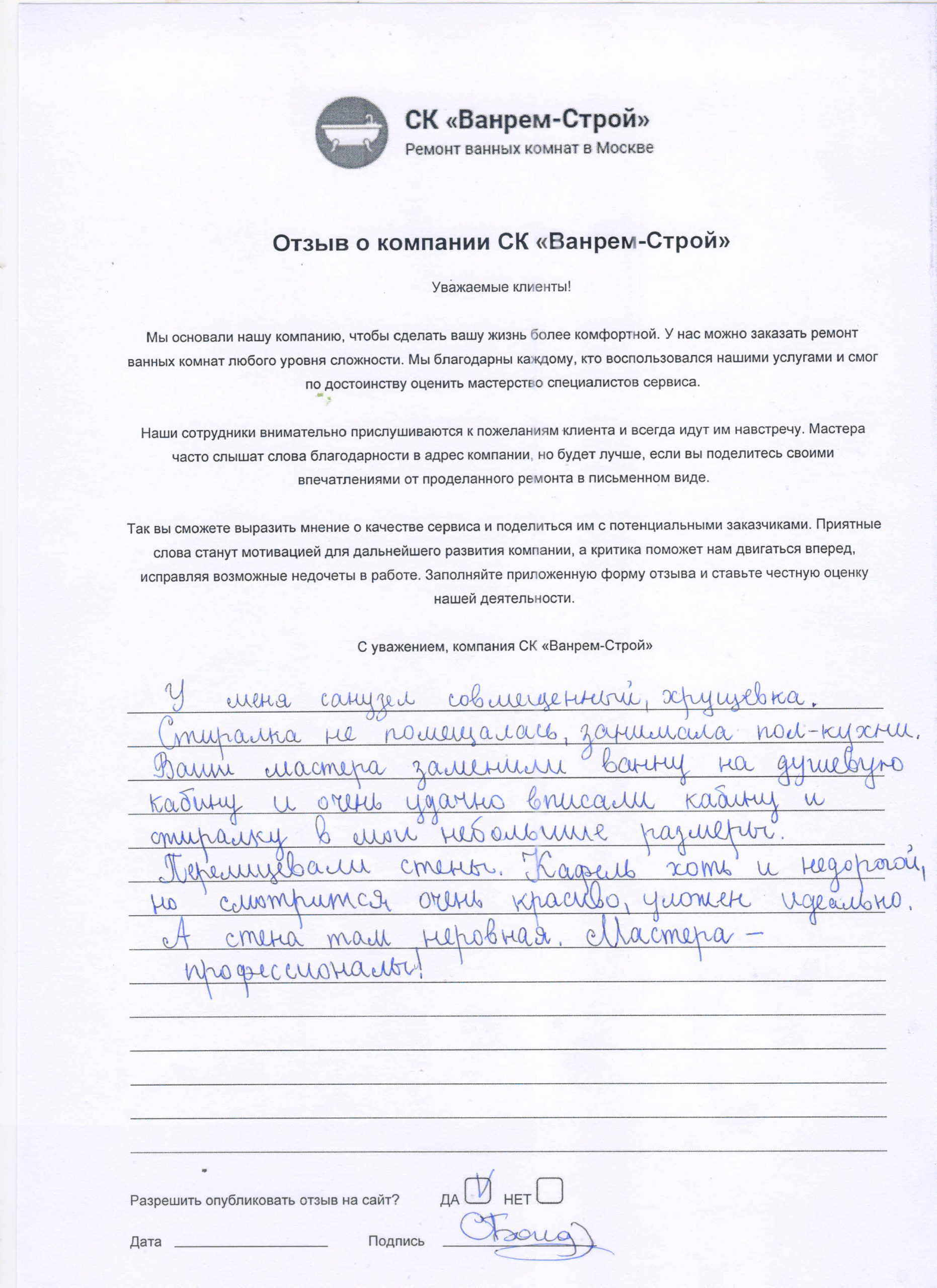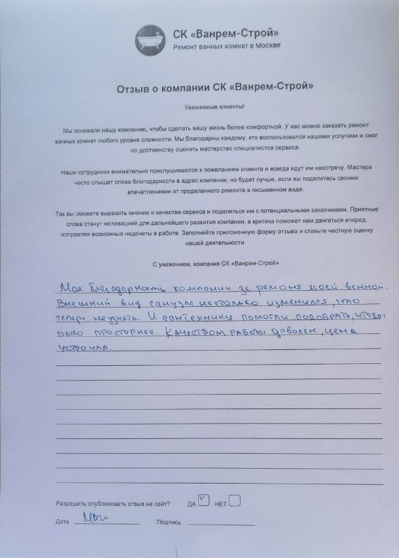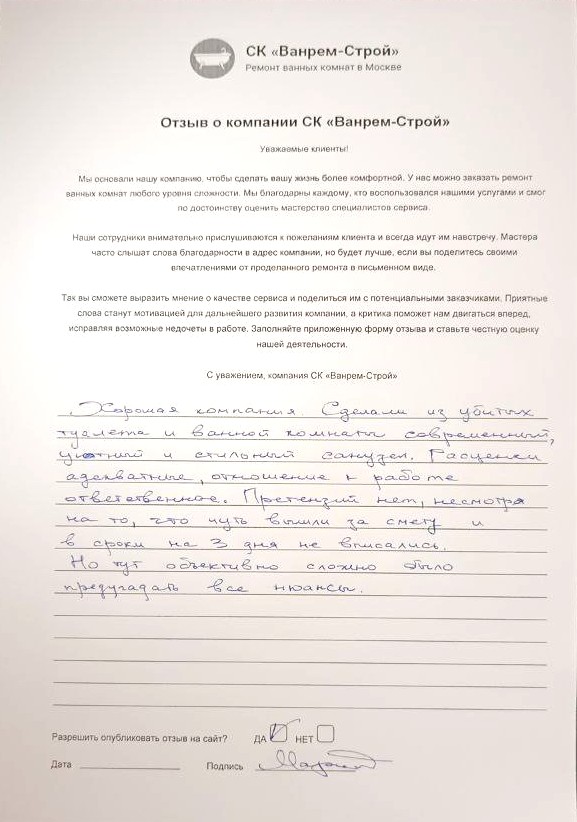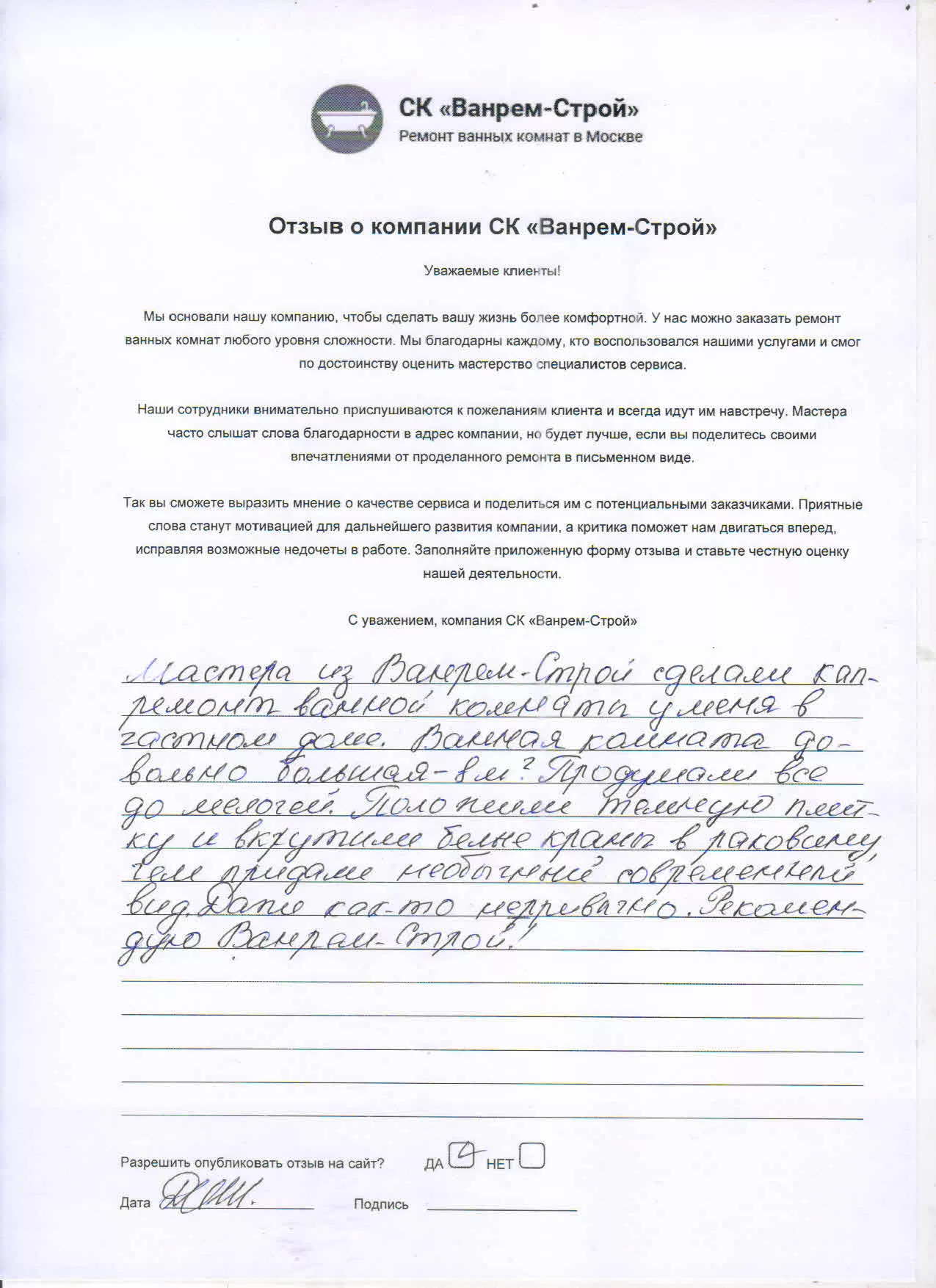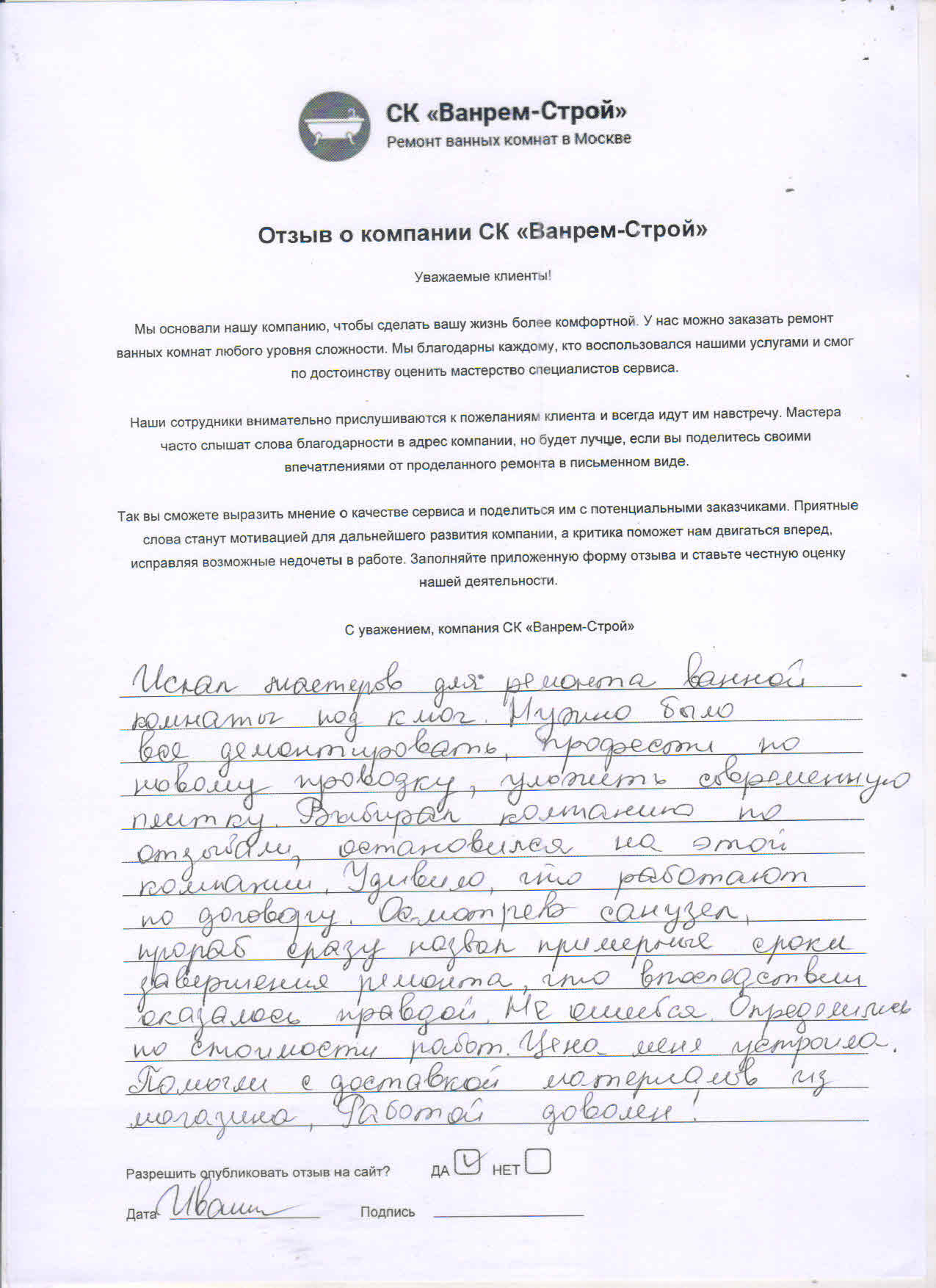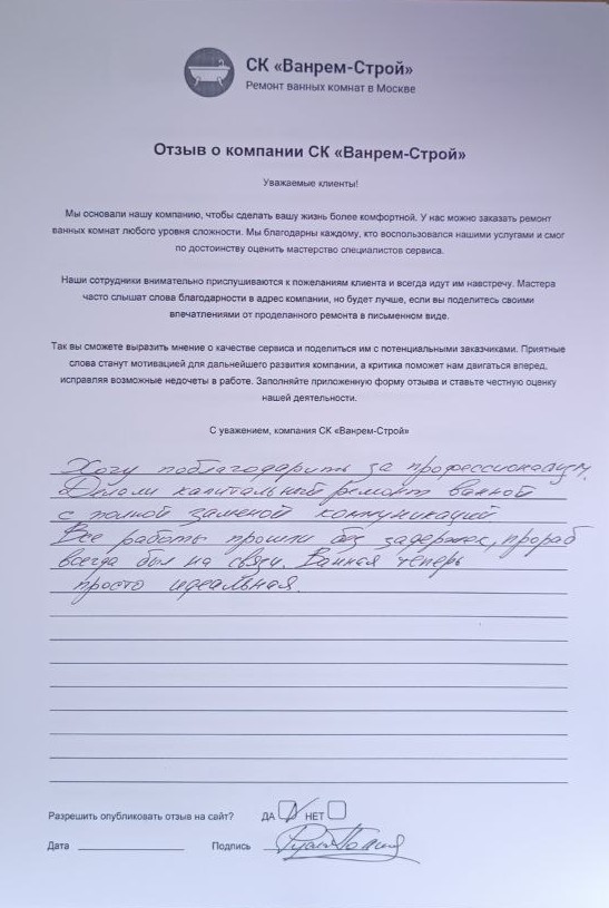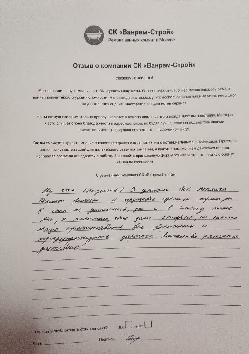 Реальные заказчики дают объективную оценку комплексной работы коллектива сотрудников СК «Ванрем-Строй». Для получения достоверной информации о качестве предоставляемых нами услуг по ремонту ванных комнат, санузлов и туалетов, изучите отзывы клиентов нашей компании.