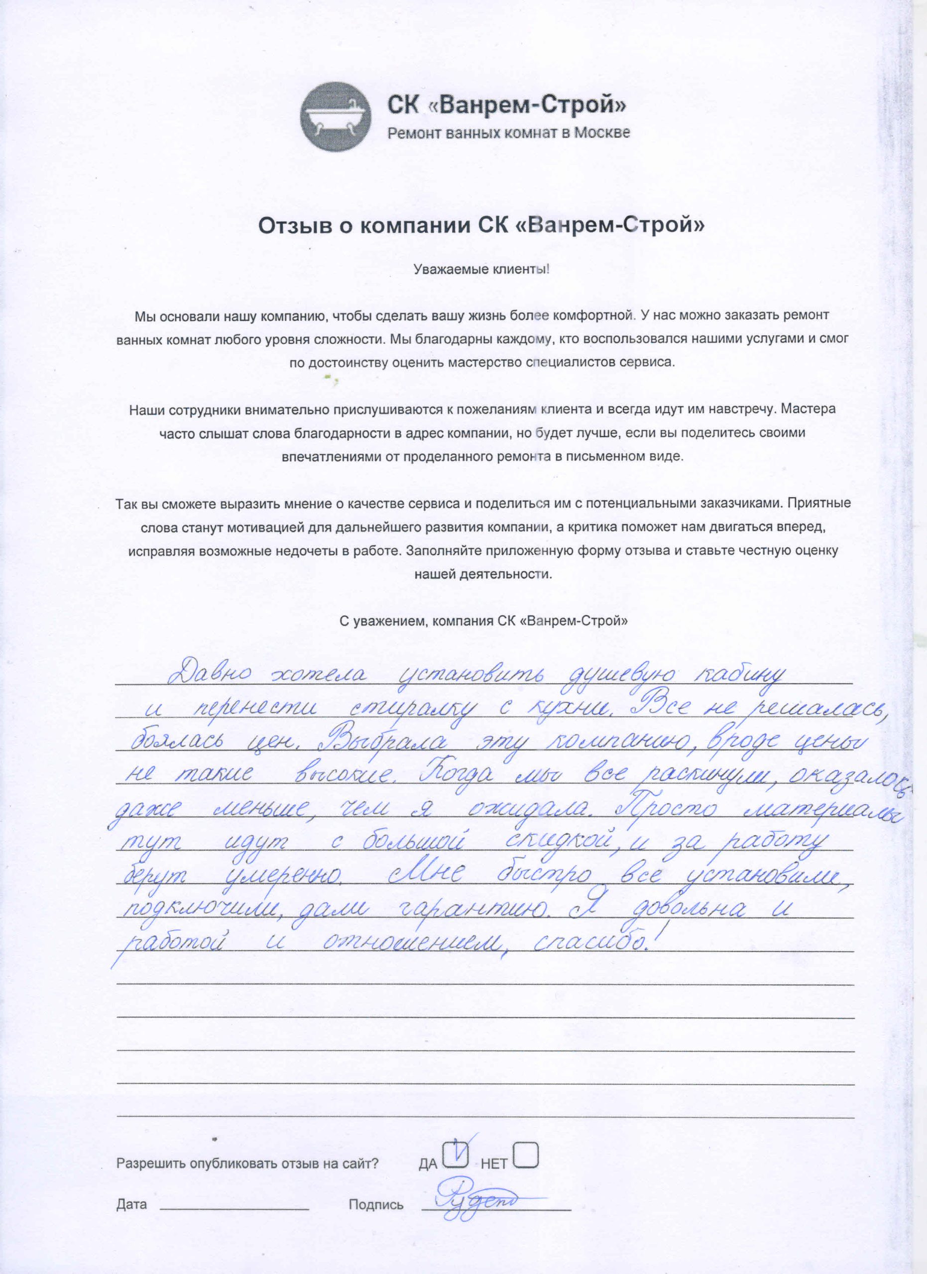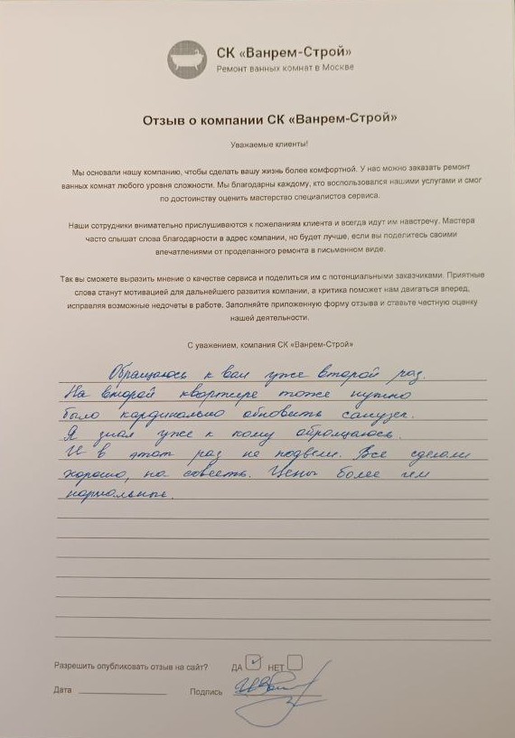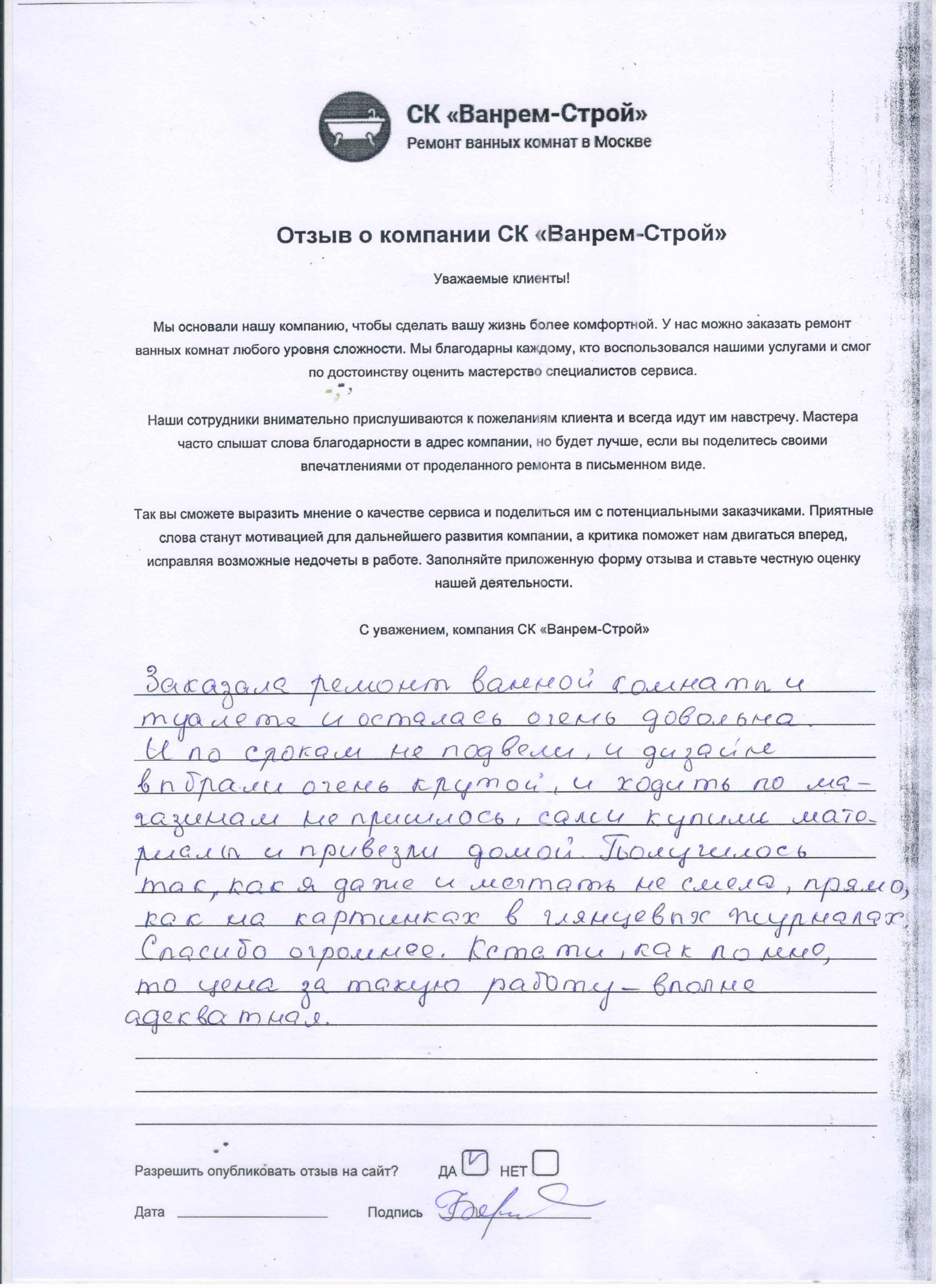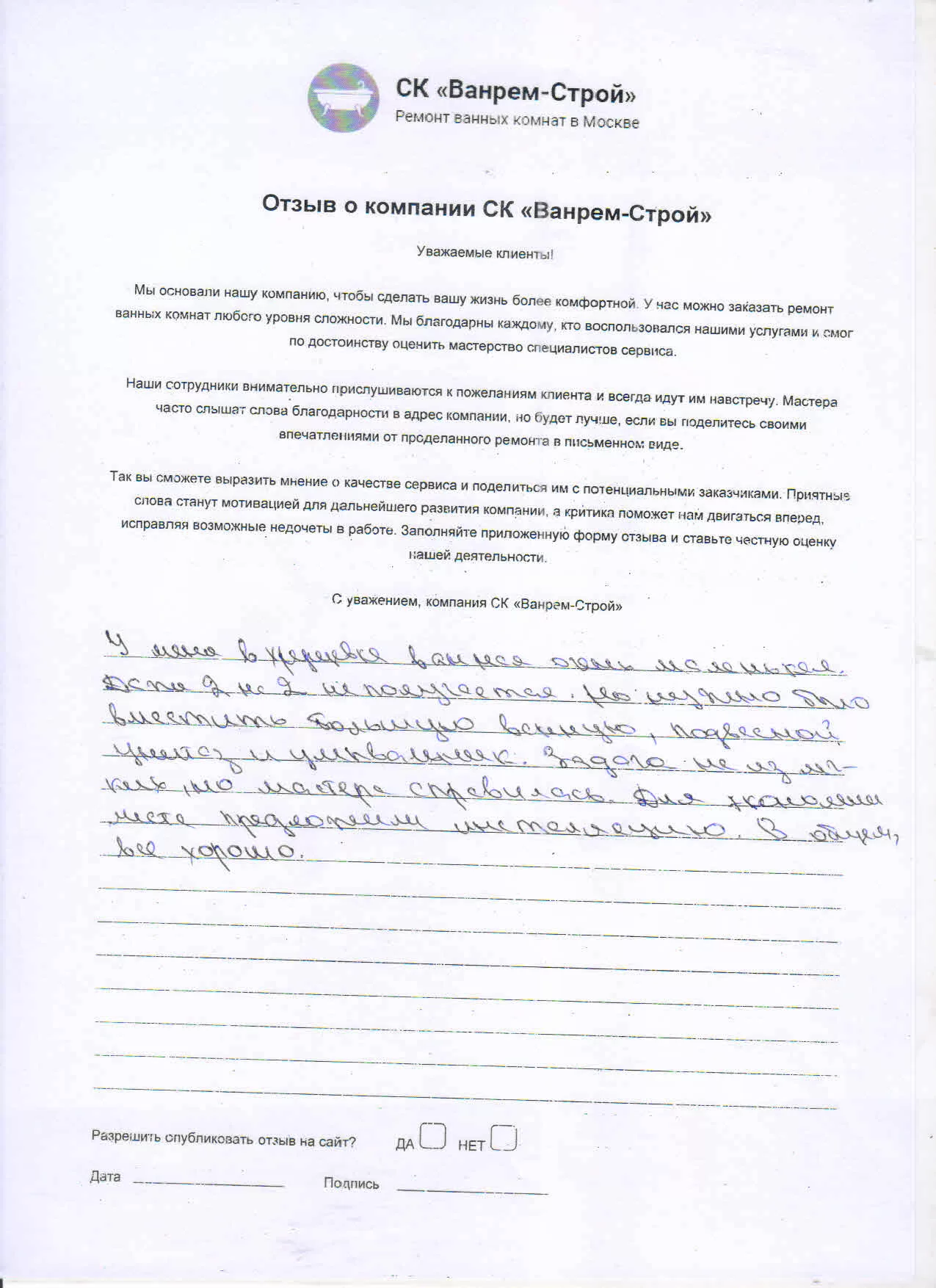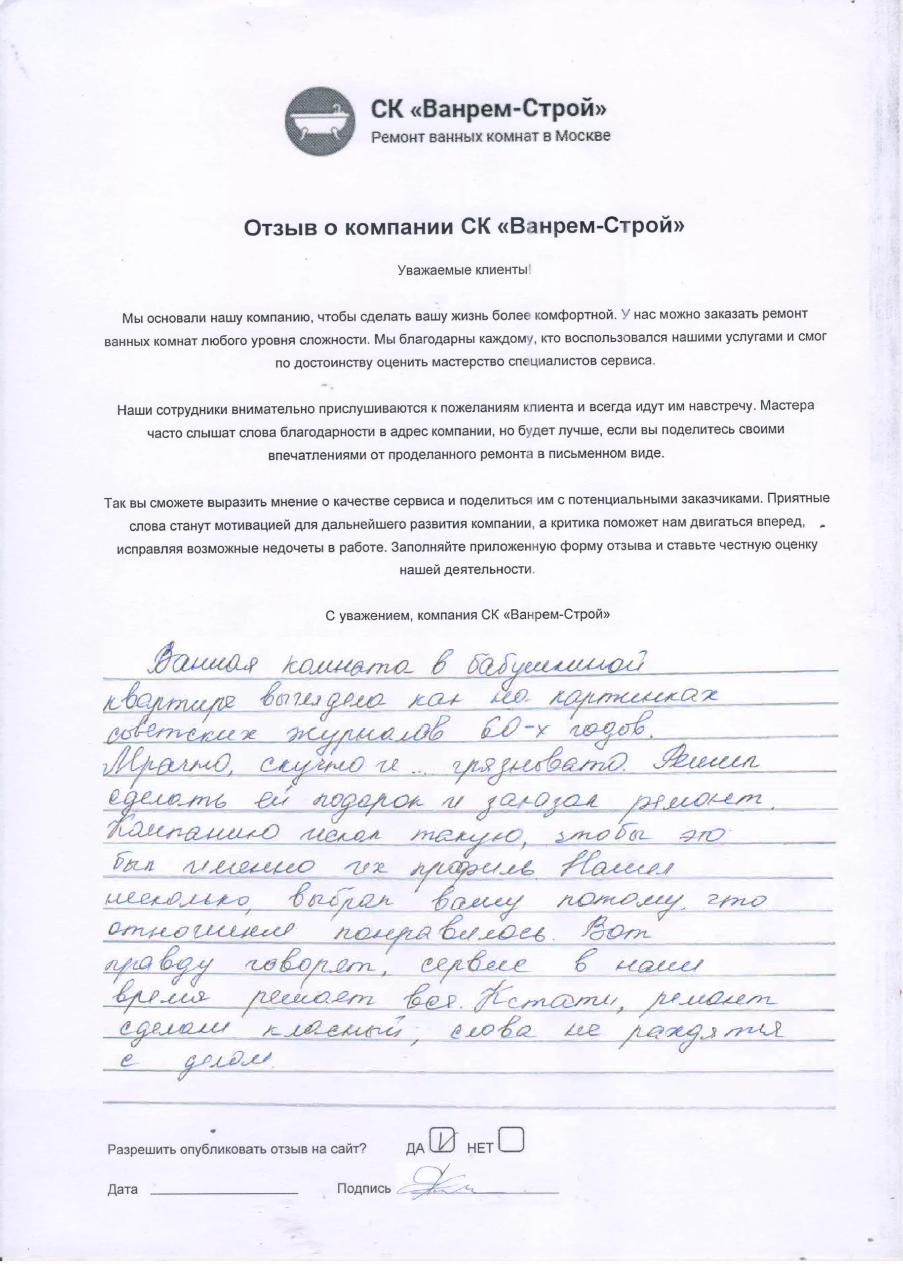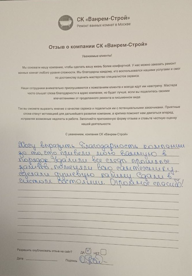 Реальные заказчики дают объективную оценку комплексной работы коллектива сотрудников СК «Ванрем-Строй». Для получения достоверной информации о качестве предоставляемых нами услуг по ремонту ванных комнат, санузлов и туалетов, изучите отзывы клиентов нашей компании.