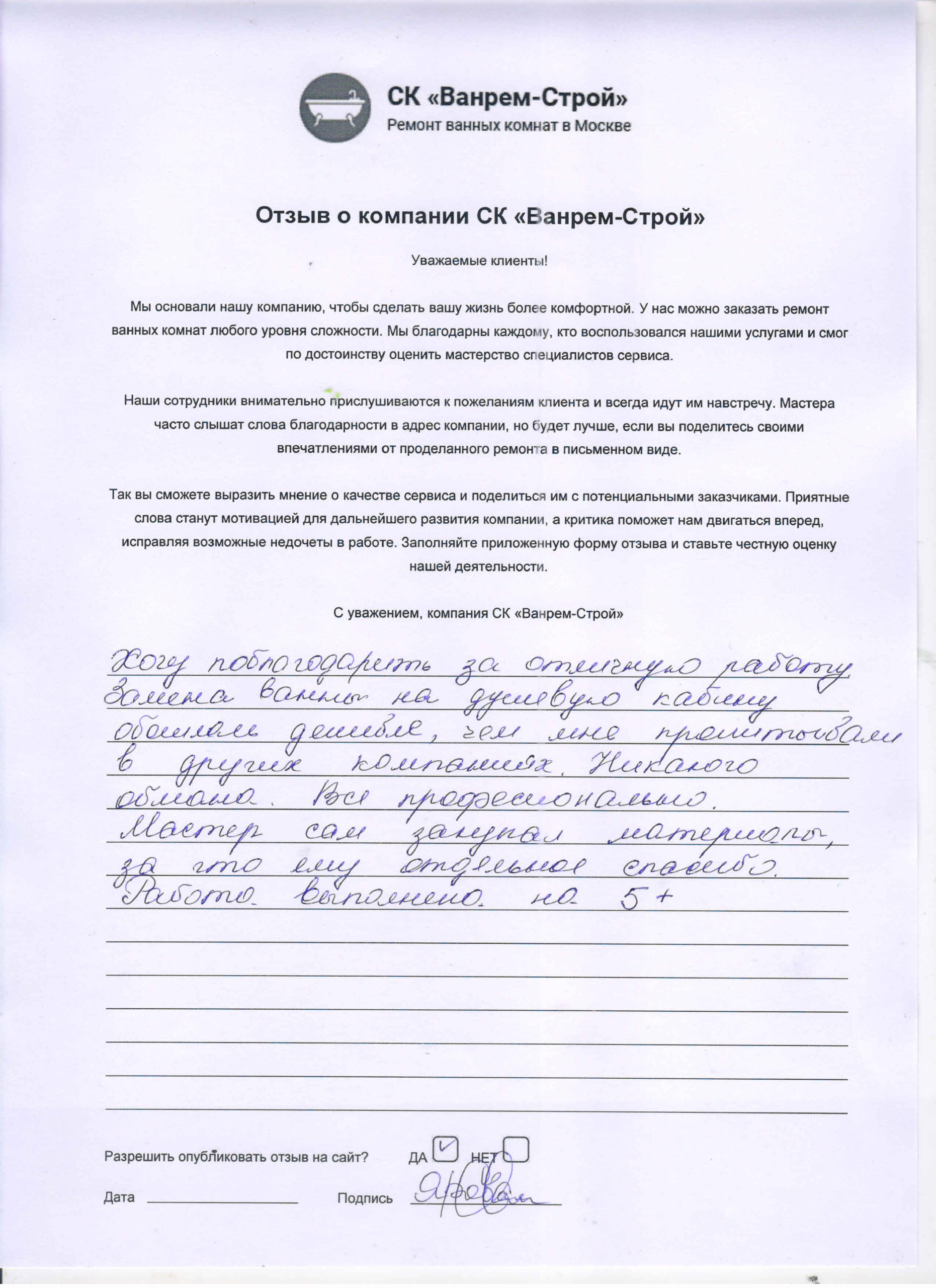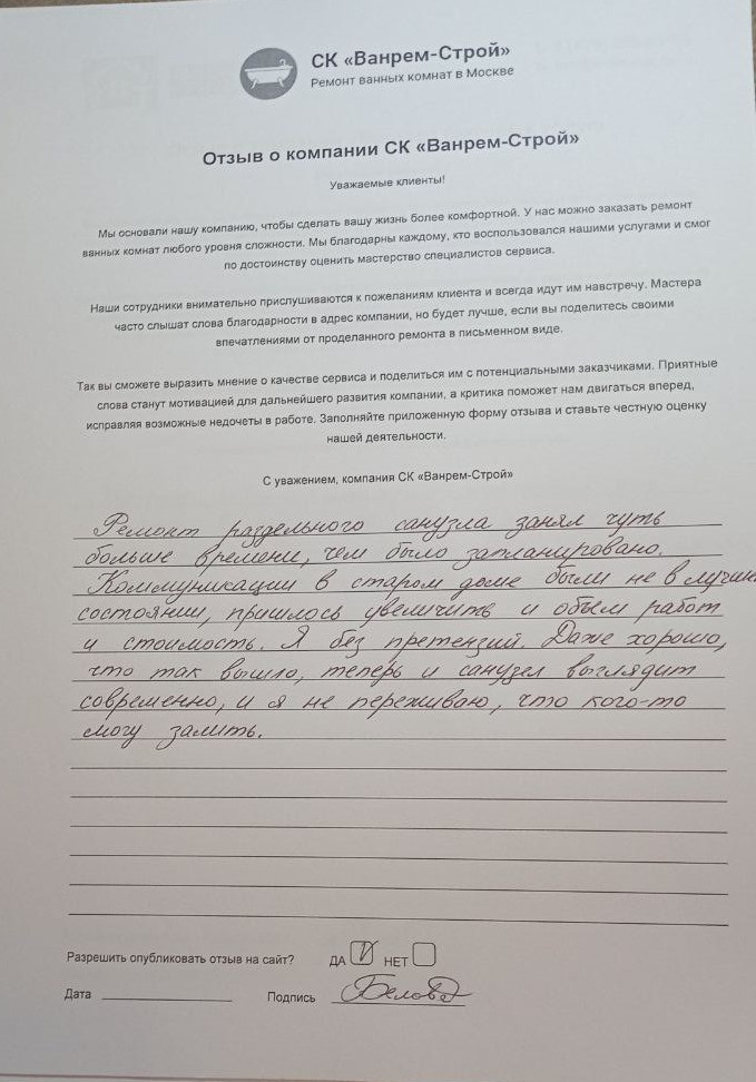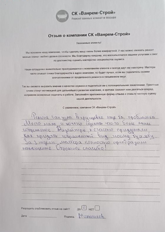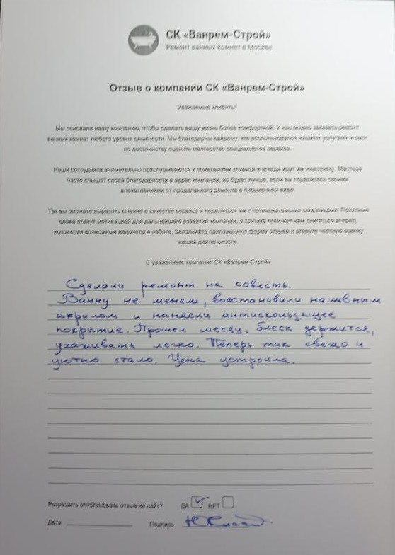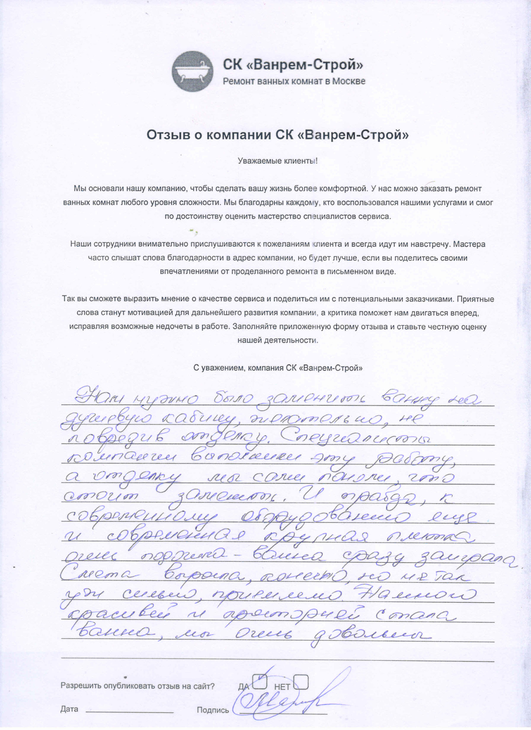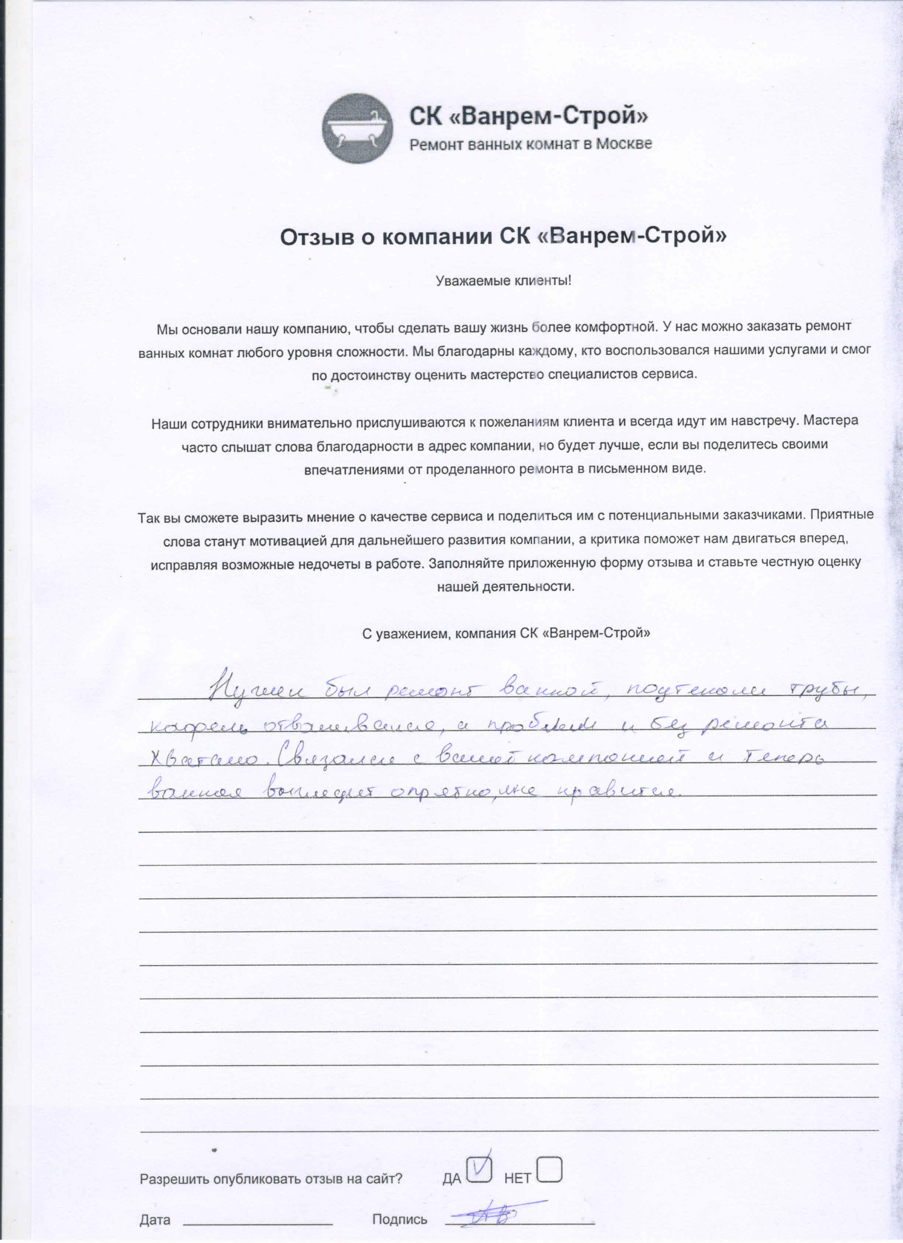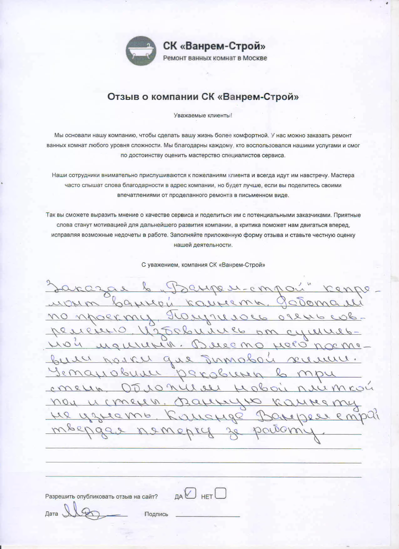 Реальные заказчики дают объективную оценку комплексной работы коллектива сотрудников СК «Ванрем-Строй». Для получения достоверной информации о качестве предоставляемых нами услуг по ремонту ванных комнат, санузлов и туалетов, изучите отзывы клиентов нашей компании.