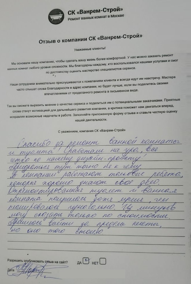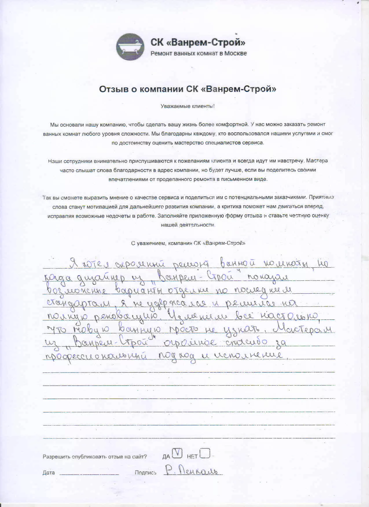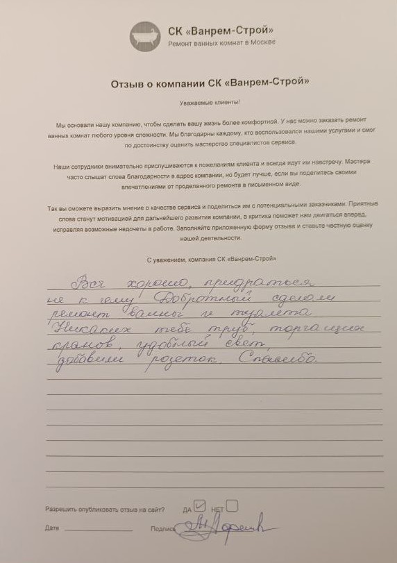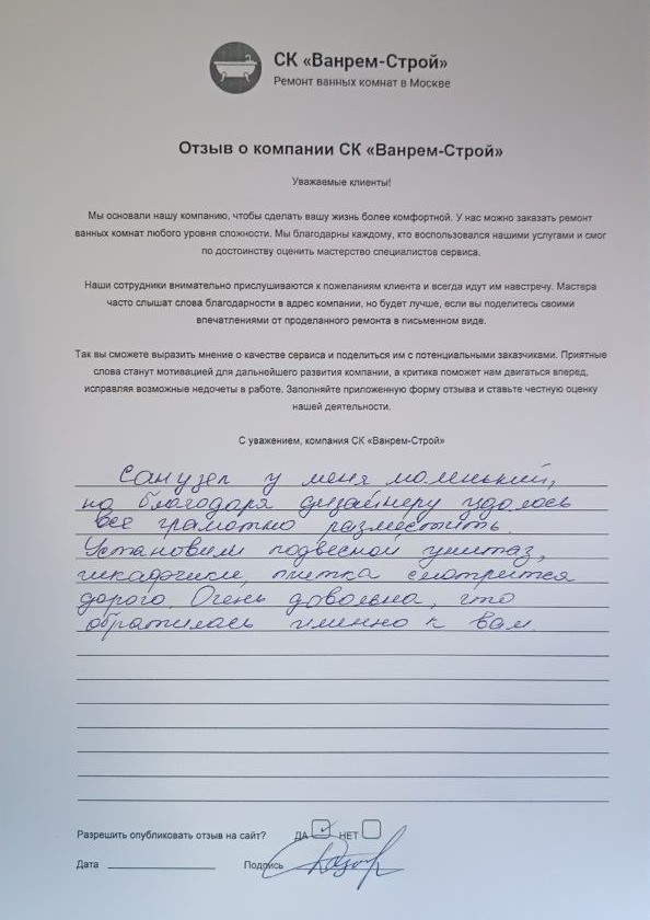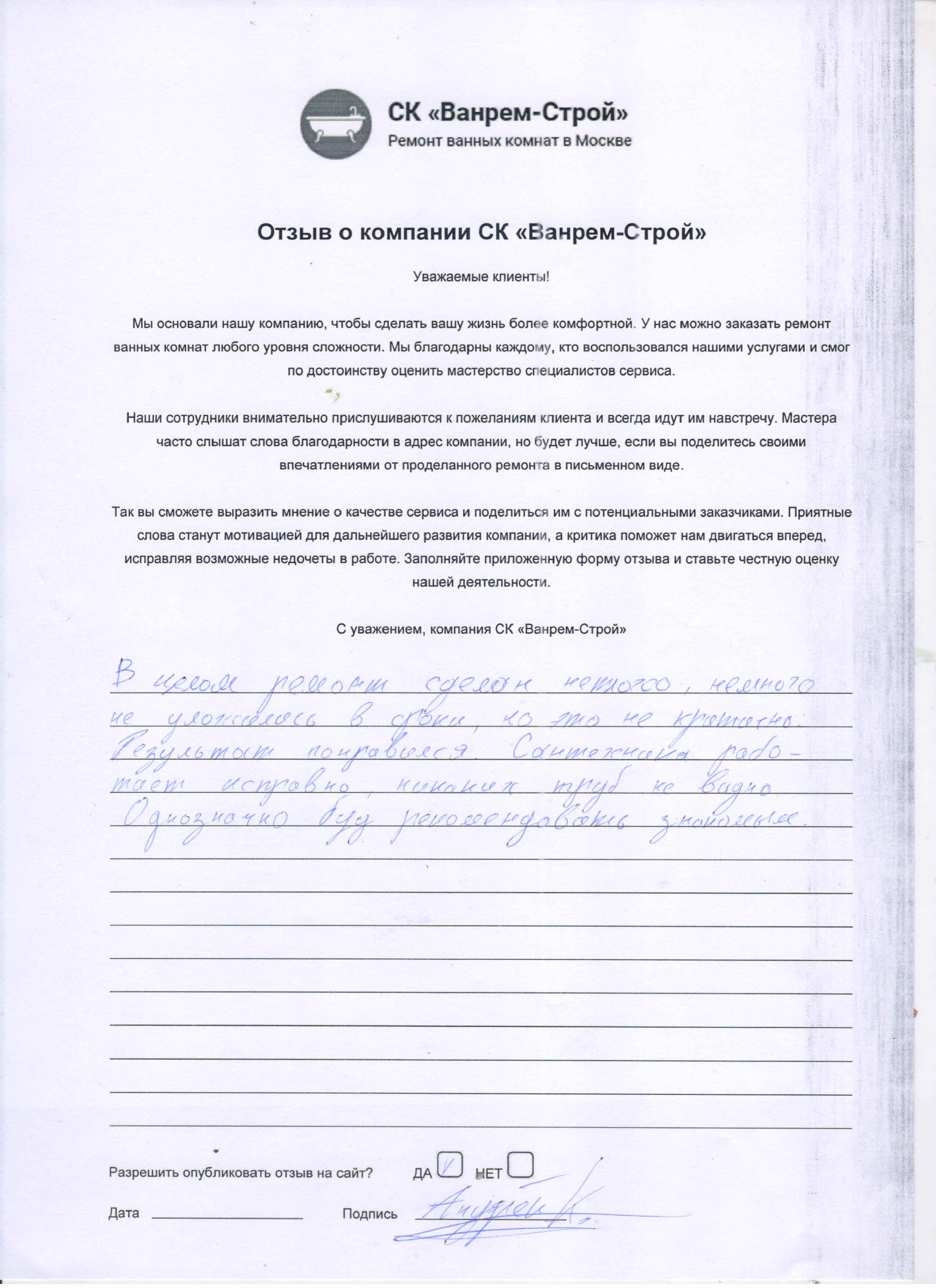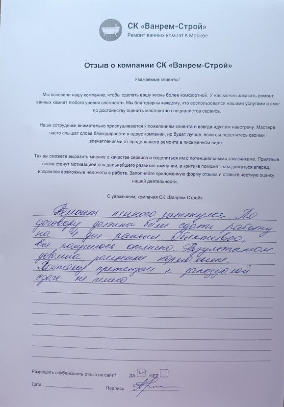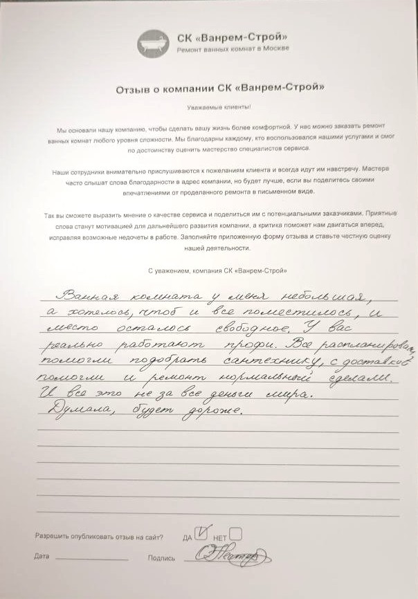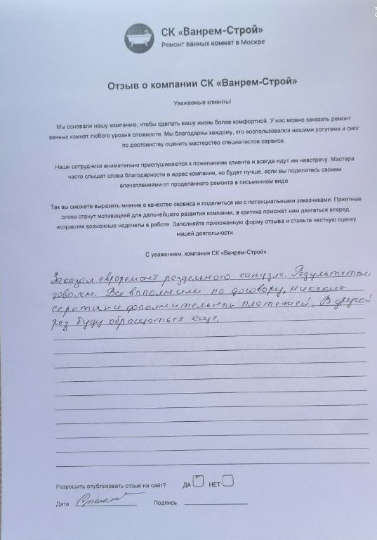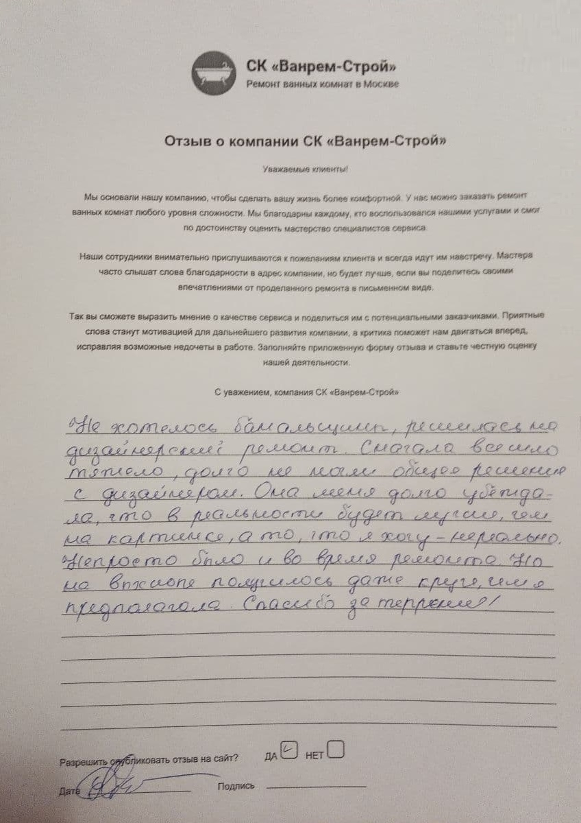 Реальные заказчики дают объективную оценку комплексной работы коллектива сотрудников СК «Ванрем-Строй». Для получения достоверной информации о качестве предоставляемых нами услуг по ремонту ванных комнат, санузлов и туалетов, изучите отзывы клиентов нашей компании.