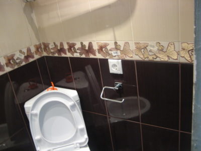 Наша компания выполнила ремонт санузла на Рязанском проспекте. Изюминкой интерьера стало оформление дизайна неординарным орнаментом. Декоративные плитки и фреза с изображением золотых бабочек перемежаются с однотонным кафелем бежевого и темно-коричневого цветов. За счет контраста удалось визуально расширить пространство.