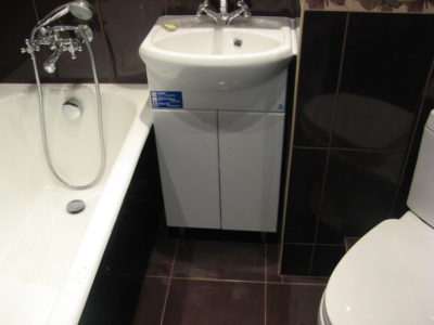 Мы установили унитаз, акриловую ванну с гибким душем, рукомойник со шкафом и зеркалом, а также смонтировали держатели для туалетной бумаги и полотенец. Проведена новая электропроводка и выполнен монтаж электрического полотенцесушителя. Подвесной потолок оформлен пластиковыми панелями со встроенными светильниками. Смета ремонта — 108000 р. Черновые материалы — 36 тыс. руб.