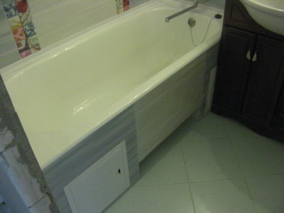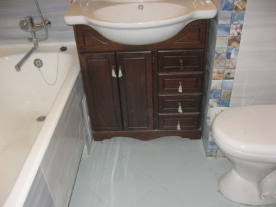 Главными достоинствами дизайна ремонта совмещенного санузла ванной на Сумском проезде стали белоснежные полы, тумба под рукомойник с темно-коричневыми фасадами и декорирование стен флористическими узорами. Изысканности интерьеру придают мозаика вдоль поверхностей и боковые светильники, выполненные в старинном стиле. В небольшом помещении мы установили новую ванну с гибким душем, умывальник со шкафчиком, унитаз, полотенцесушитель и сушилку для белья. Смета на ремонт составила 98 тысяч рублей. На закупку черновых материалов ушло 29 тыс. руб.