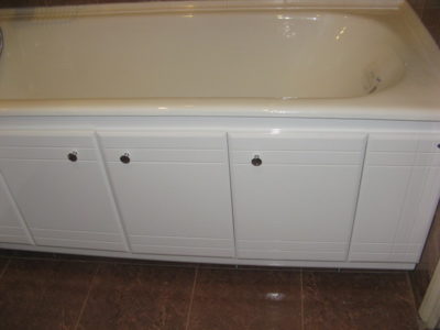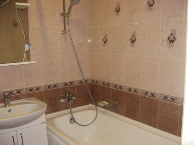 Наша компания выполнила ремонт совмещенного санузла на улице Краснобогатырской. В ходе проведения демонтажных и ремонтно-отделочных работ были полностью заменены отделка поверхностей и установлена новая сантехника (акриловая ванна, мойдодыр, унитаз и электрический полотенцесушитель). Для облицовки стен использовалась бежевая и коричневая керамическая плитка. На пол уложен темный кафель в тон общему интерьеру. Защитный экран под ванной выполнен в виде распашных дверок. Потолок оформлен пластиковыми панелями. Над дверью смонтировано боковое бра. Смета на ремонт — 125000 рублей. Стоимость черновых материалов — 40 тыс. руб.