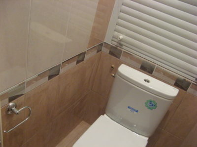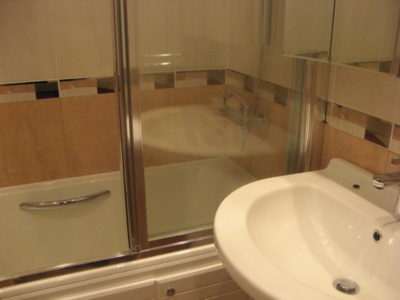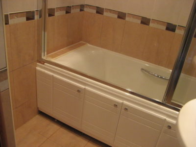 Мы выполнили ремонт ванной комнаты и туалета на большой Черемушкинской в едином стилевом решении. Для отделки стен и пола использовались керамические плиты нежных оттенков (розовый и бежевый). По центру боковых поверхностей уложена декоративная фреза. В туалете установлен унитаз, а инженерные коммуникации скрыты за защитным экраном с вертикальными жалюзи. В ванной комнате мы смонтировали ванну, укомплектованную раздвижными стеклянными шторами и умывальник модели «Тюльпан». На стену повесили большое зеркало, а полость под ванной задекорировали белыми фасадами. Цена ремонта — 122 тысячи рублей. Расходы на черновые материалы — 33 тыс. р.