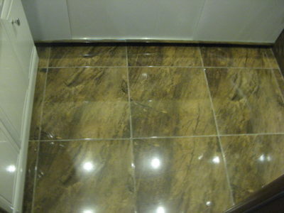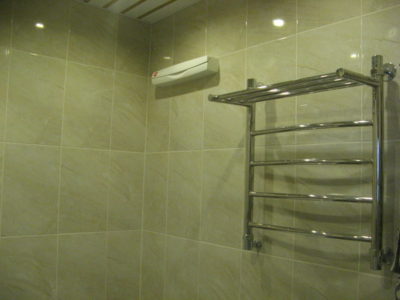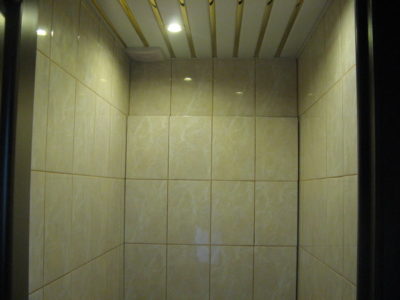 В ванной комнате удалось компактно расположить ванну с боковыми ручками и гибким душем, мойдодыр на три секции и навесные полки. Точечные светильники вмонтированы в подвесной потолок из пластиковых панелей. В туалете установлен новый унитаз, стены облицованы двухцветным кафелем, а на пол уложена керамическая плита с имитацией под мрамор.
