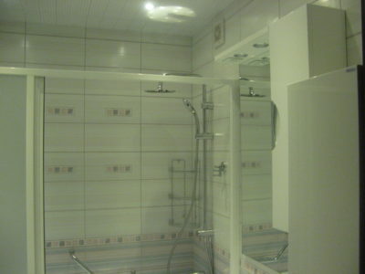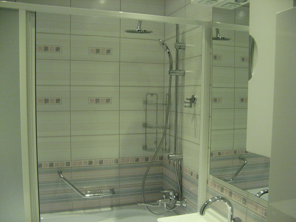 Полы и стены ванной комнаты облицованы керамической плитой с горизонтальным рисунком. В помещении установлены ванна с функцией джакузи, раздвижные шторы, умывальник с тумбой, полка для полотенец, полотенцесушитель, вертикальный шкаф и стиральная машина. Стоимость черновых материалов — 32200 руб. Цена ремонта — 120 тыс. 900 руб.