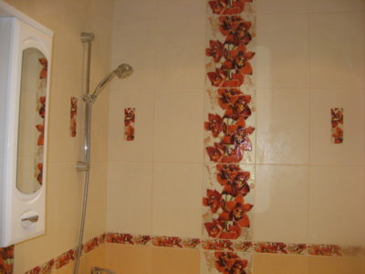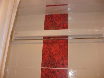 Наша компания выполнила ремонт ванной комнаты и туалета в квартире, расположенной на улице Кольская, в эксклюзивном дизайне под ключ. Для облицовки поверхностей использовалось два типа керамической плитки: однотонная нежного кремового цвета и украшенная ярко-красными розами. Нарядности интерьеру придают позолоченные элементы декора и аксессуары. Для экономии места стиральная машина установлена под навесной умывальник. В туалете распределительный коллектор спрятан за вертикальными жалюзи. На стену около унитаза вмонтированы держатели для бумаги и освежителя воздуха. Общая сумма составила 124200 рублей. Черновые материалы — 32 тысяч.