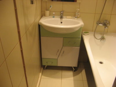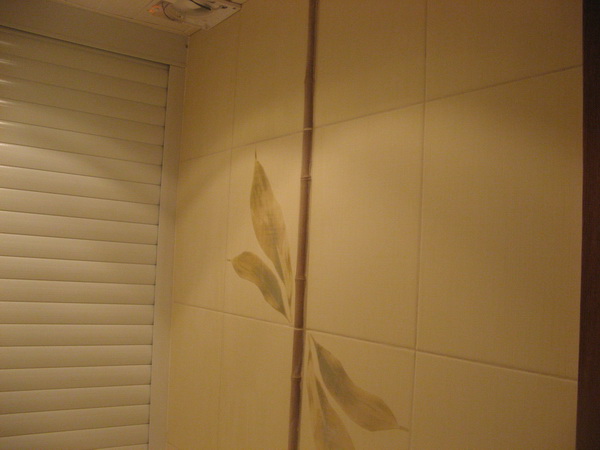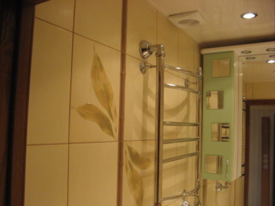 В ходе ремонта были полностью демонтированы устаревшее сантехническое оборудование и отделка с поверхностей. На стены и полы в помещениях уложена керамическая плитка оливкового цвета, а потолок выполнен из пластиковых панелей. Привнести в дизайн нотку элегантности удалось за счет укладки декоративных элементов с имитацией под бамбуковое дерево.