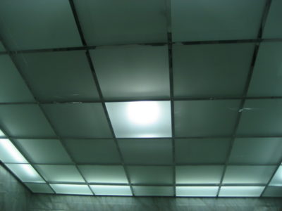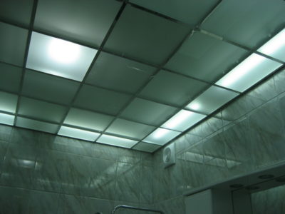 В помещениях мы установили акриловую ванну, мойдодыр и унитаз с функцией биде. Инженерные коммуникации скрыты за защитным экраном. Потолок оборудован стеклянными подвесными панелями, за которыми смонтированы светодиодные лампы.